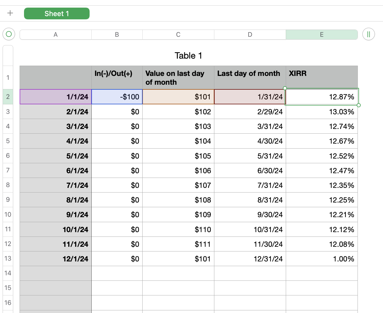 Each row represents one month: "last_month_day_balance - month_day_1_balance" == ROI in dollars.
