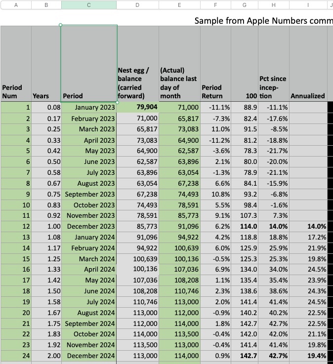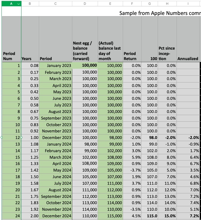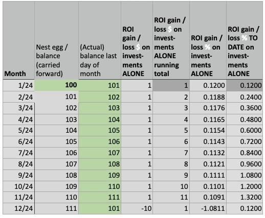 NOTE: To focus on getting the ROI data correct, I didn't mention earlier, but to derive (monthly) annualized ROI, I subtract day1Balance from lastDayBalance, but then add back in any withdrawals I made as well as any financial advisor fee (that isn't reflected above). (I could also have a column that shows ROI, factoring in the advisor fee.)