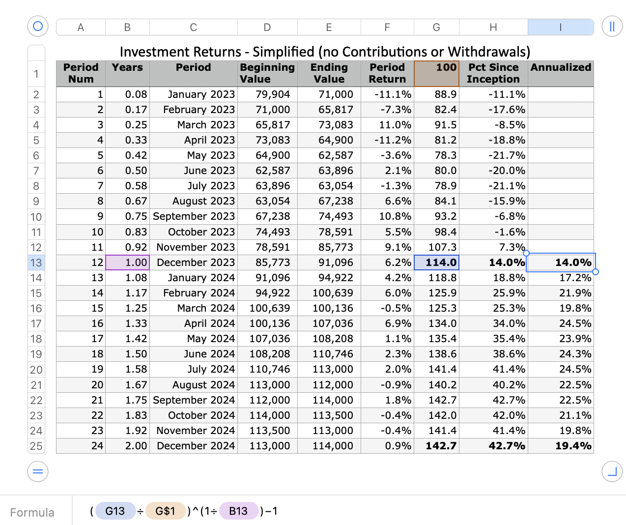 I have a spreadsheet where, in part, I am tracking annualized ROI percentage on investment. The part I'm (mainly) looking for potential feedback on is in bold.