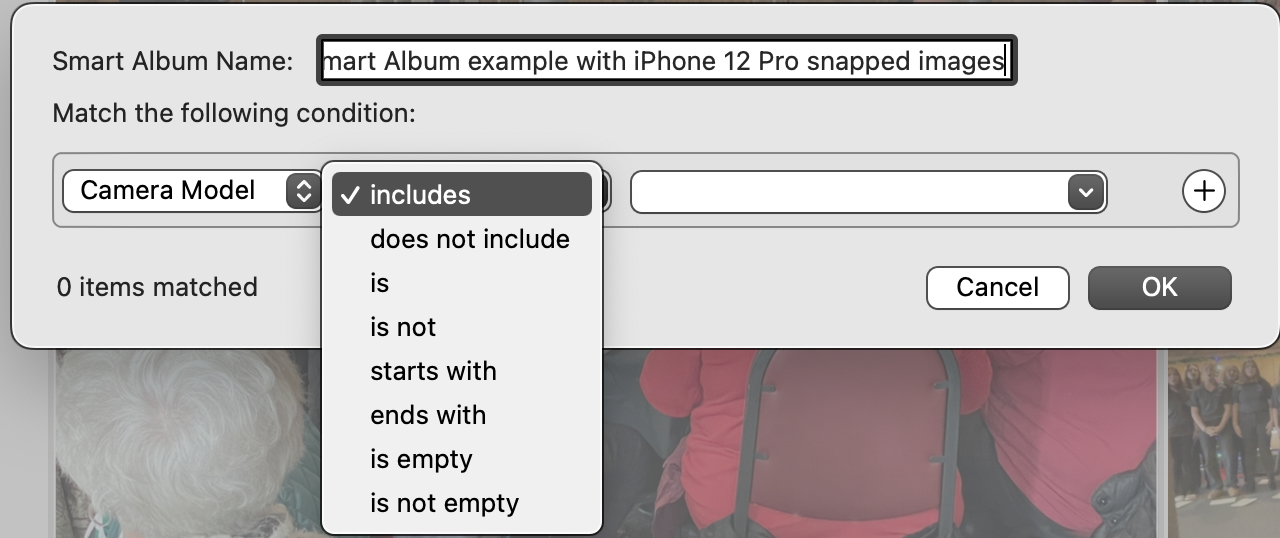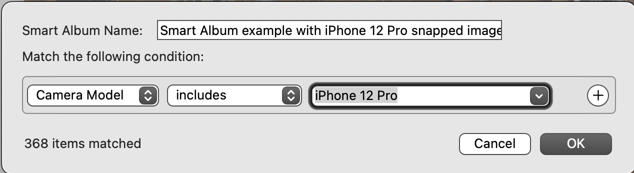 On macOS Photos, you have far more control over specifying the image criteria, including things like aperture, shutter speed, and focal length.