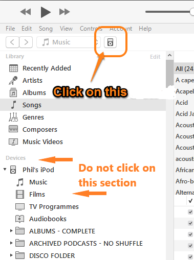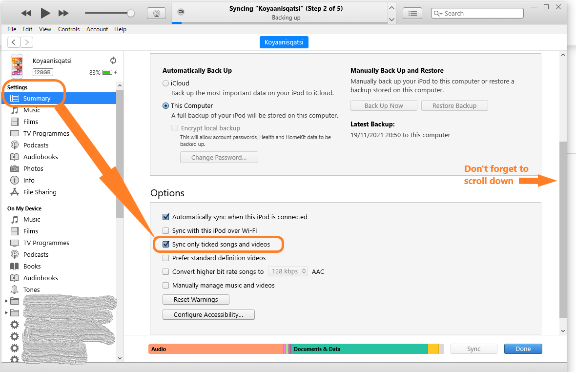 - that will display the Device/Settings/Summary pane. On that pane, look for the Sync only ticked songs and videos: