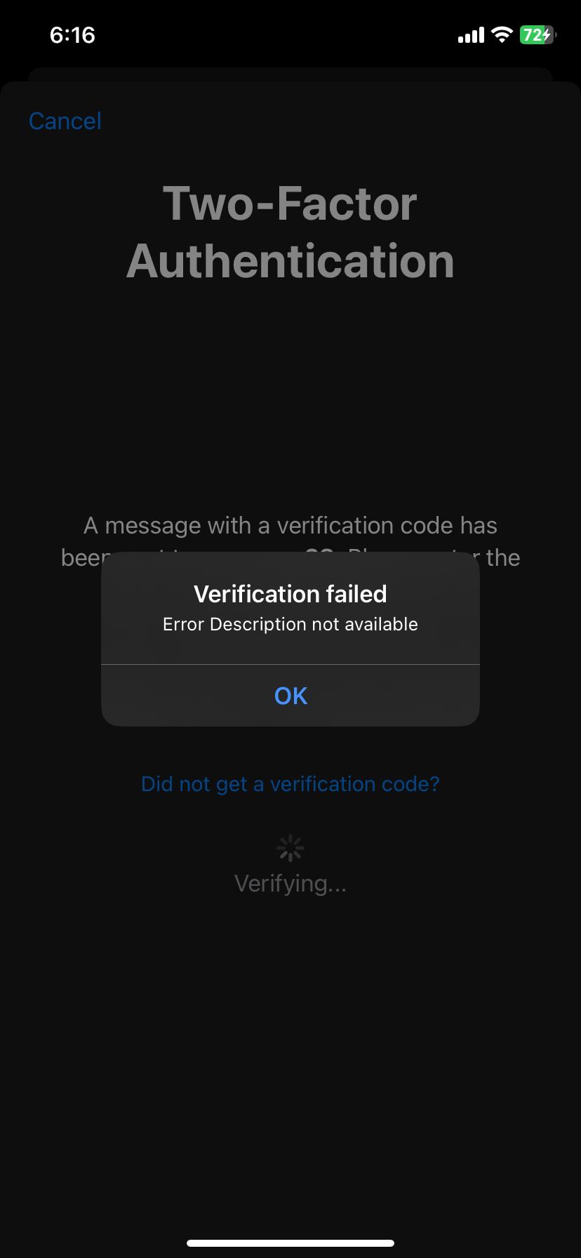 I had two factor authentication in my Apple ID and when I log in by using the right password, i get a code for the two factor authentication to log in and after I type it in, it says this.