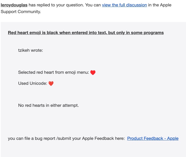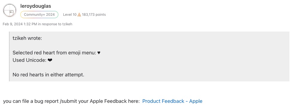 In some programs when I access the emoji keyboard, either though Ctrl-Cmd-Space or through the Edit --> Emoji & Symbols menu, if I click on the red heart, it types a small black heart instead. There doesn't seem to be anything the different programs have in common that would cause this.