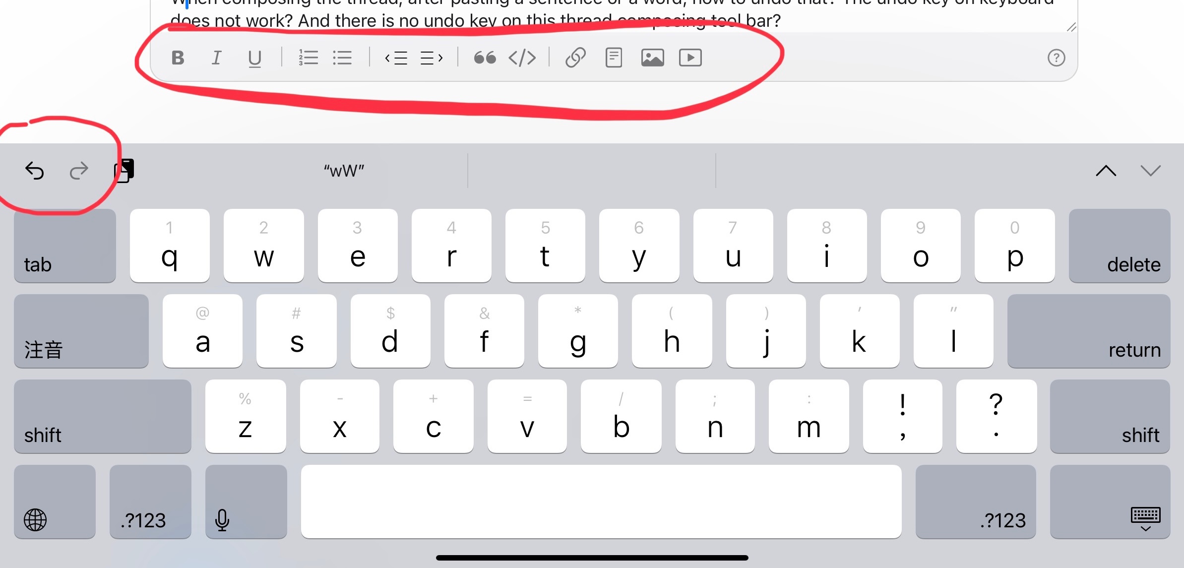 When composing the thread, after pasting a sentence or a word, how to undo that? The undo key on keyboard does not work? And there is no undo key on this thread composing toolbar?