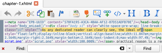 You would repeat this process for Chapter-2.xml through Chapter-n.xml (n being the last chapter of your EPUB). Then cmd+S to save the EPUB, and quit ebook-editor application.