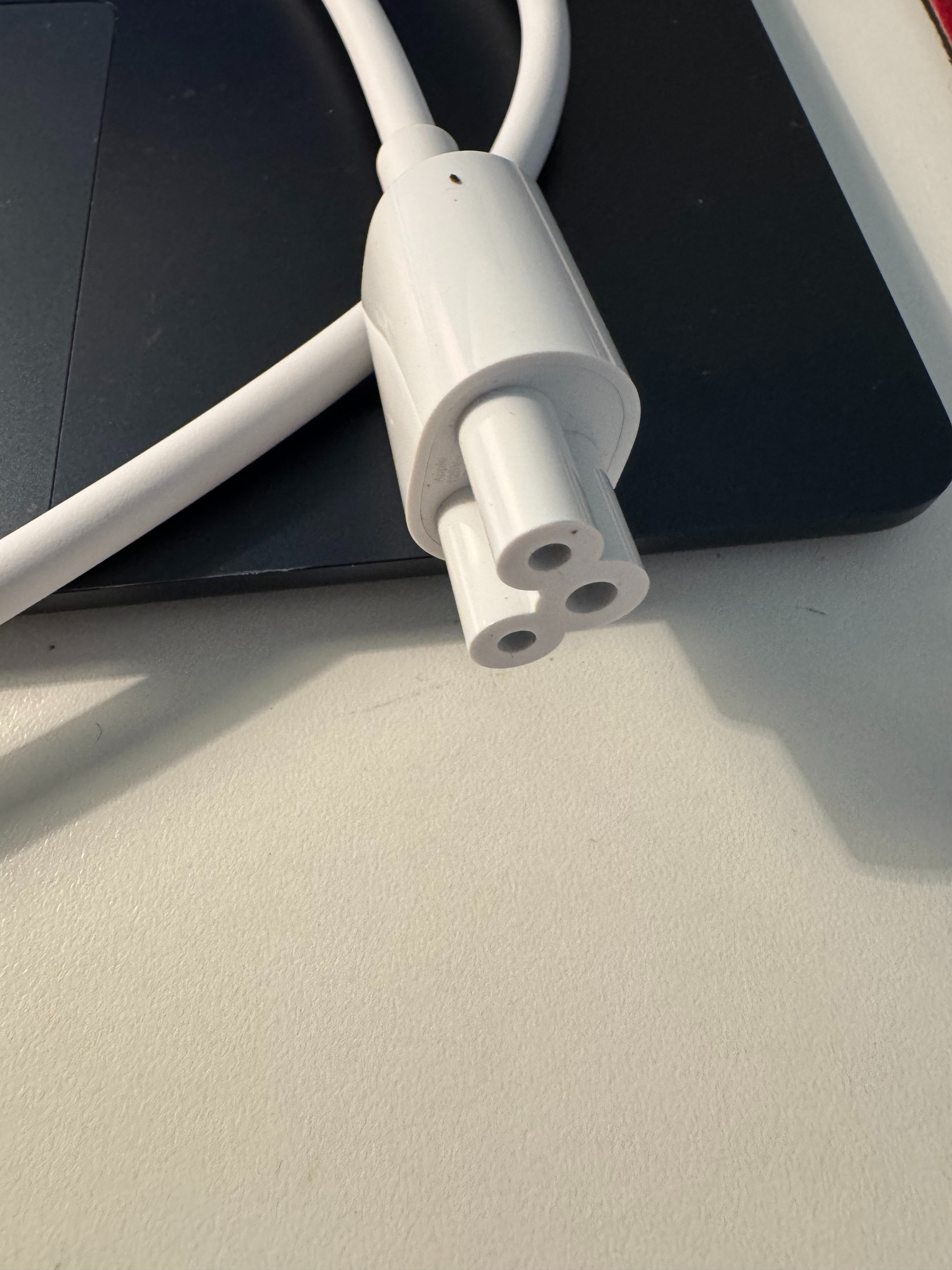 A house fire destroyed my office. My iMac 2022-24" 512 SSD could be repaired. However the cable that connects the computer to the outlet in the wall was destroyed. The Apple store people gave me the wrong AC cable. It has a 3 prong acceptor for connection. The imac has a circular single prong acceptor. Pictures attached. Lower picture is white incorrect. AC cable. The Apple people appear flummoxed about this cable. They say that I need a second part for connection and will order it. I am wondering if anyone has ever had to replace their power supply cable and if so, how did you get a new one?