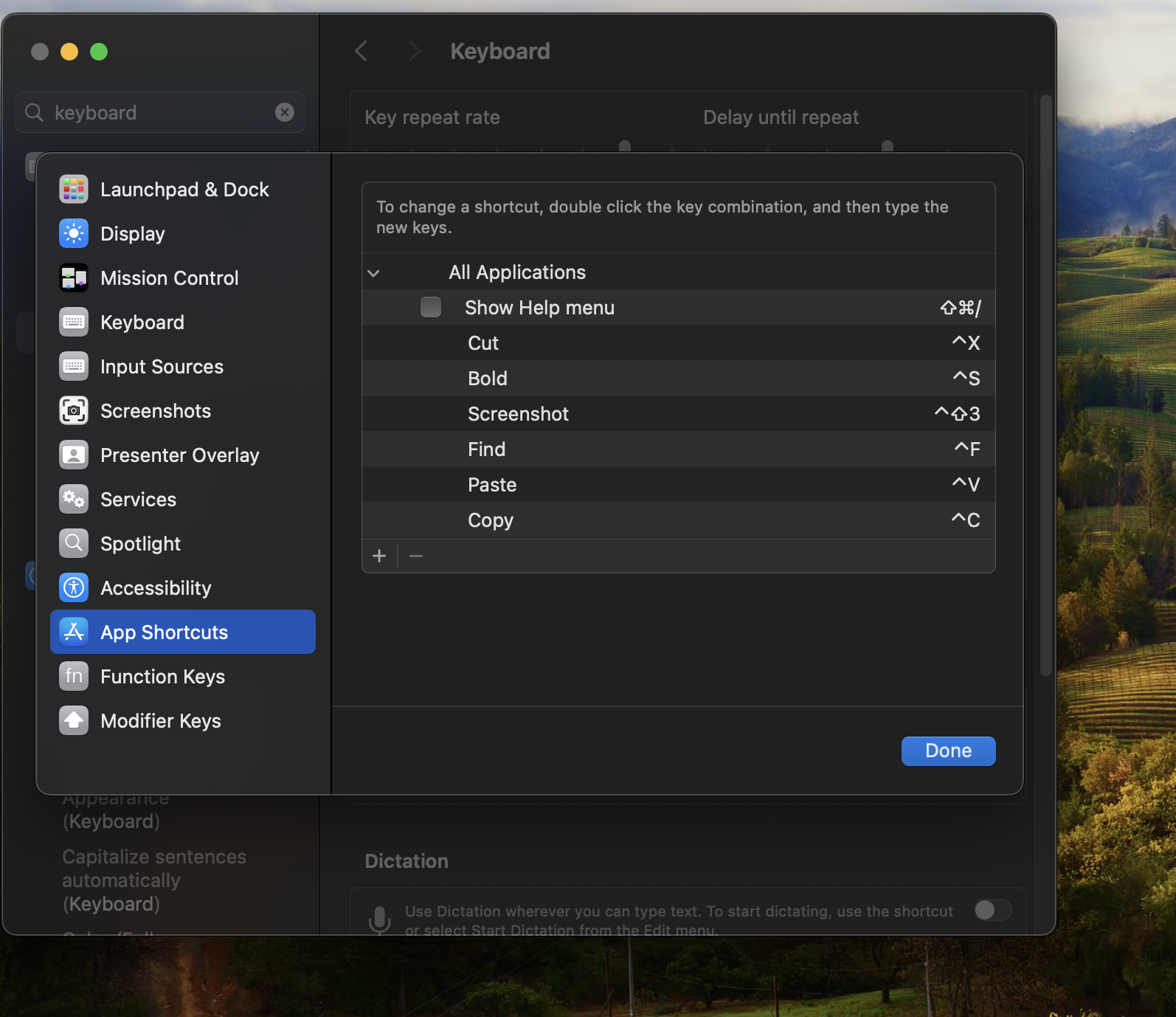 I received a laptop for work and none of the typical shortcuts are setup. You will see I have set up all shortcuts as seen in the screenshot. These all work expcept the CTRL + F and I am not sure why. My office is based in the UK so wondering if shortcuts are different across the globe assuming my laptop was purchased from a UK based Apple store?