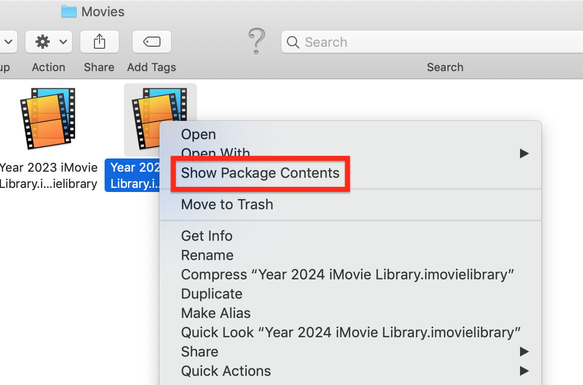 Clicking on Show Package Contents will display a folder that contains subfolders for of all of the projects and events in the library.