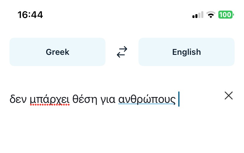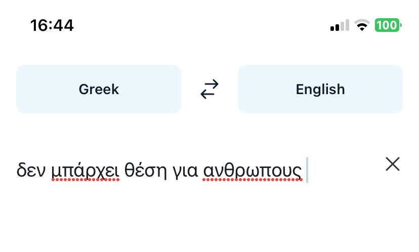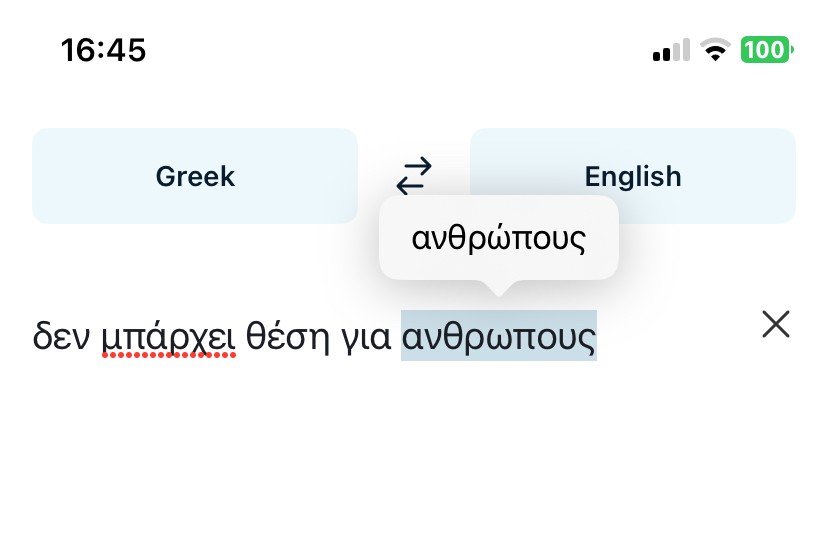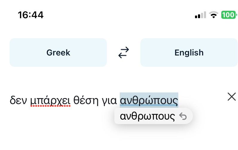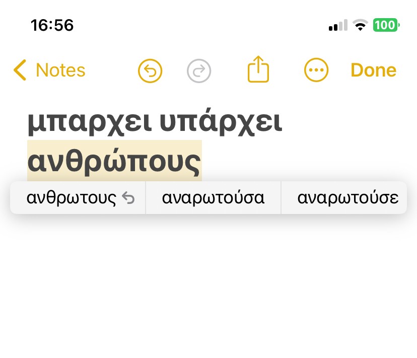 This is in the Apple Notes app and the DeepL translator app. When typing Greek words if you leave the accent off the word the spell checker tells you to add an accent. But when you then add an accent it takes it off. So the speller checker is going in a circle. For example, here you can see I correctly typed the word ανθρώπουσ but the spell checker says to remove the accent and says use ανθρωπουσ, which is wrong. When you select the suggestion it then reports that the word is spelled wrong again. Then it tells you to select ανθρώπουσ. So it is going in a circle.le Notes