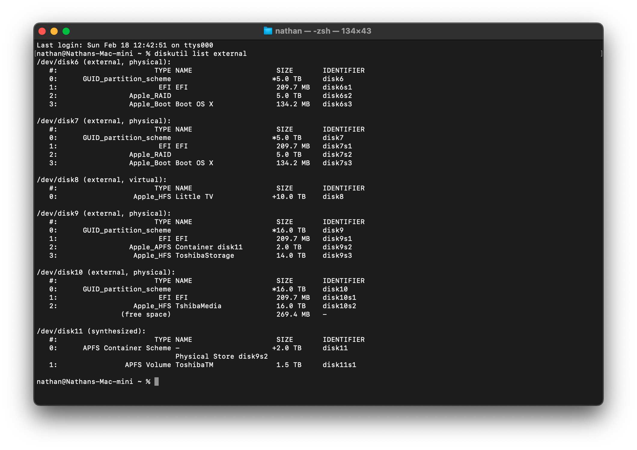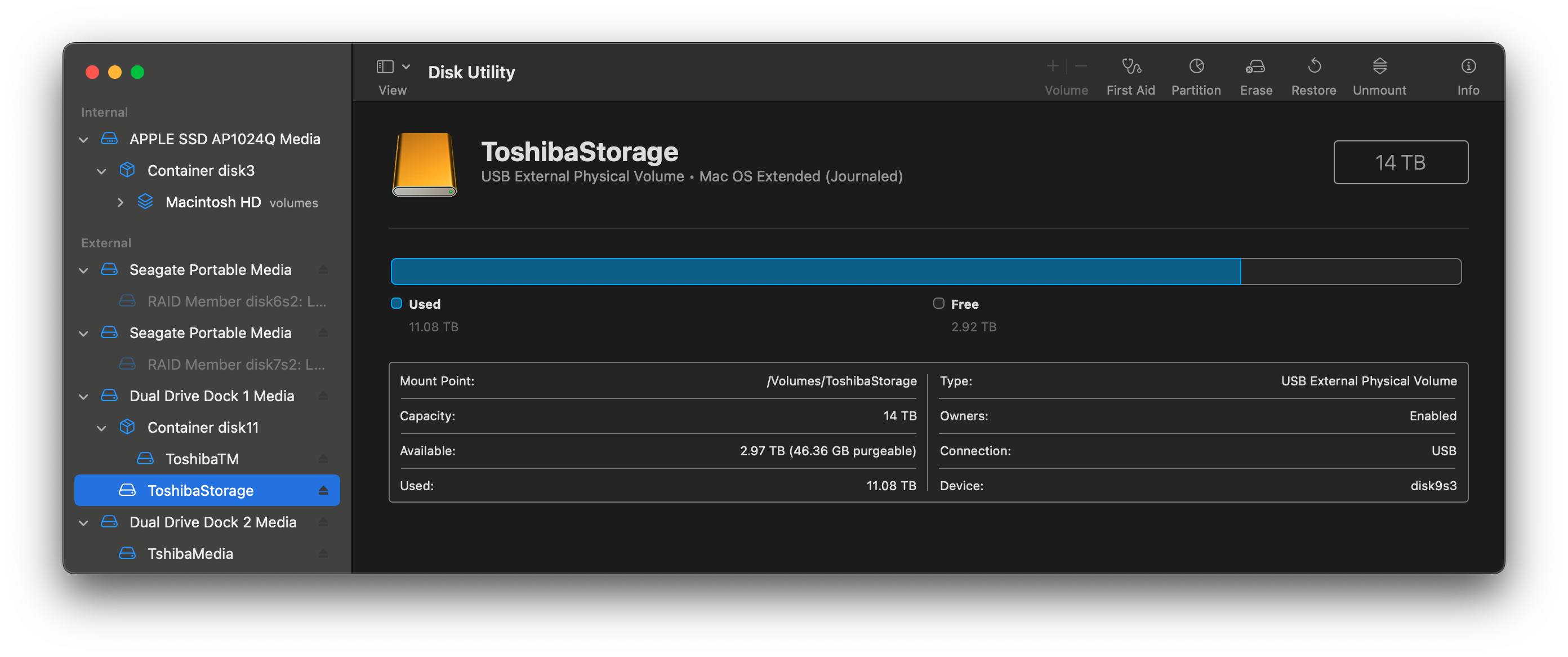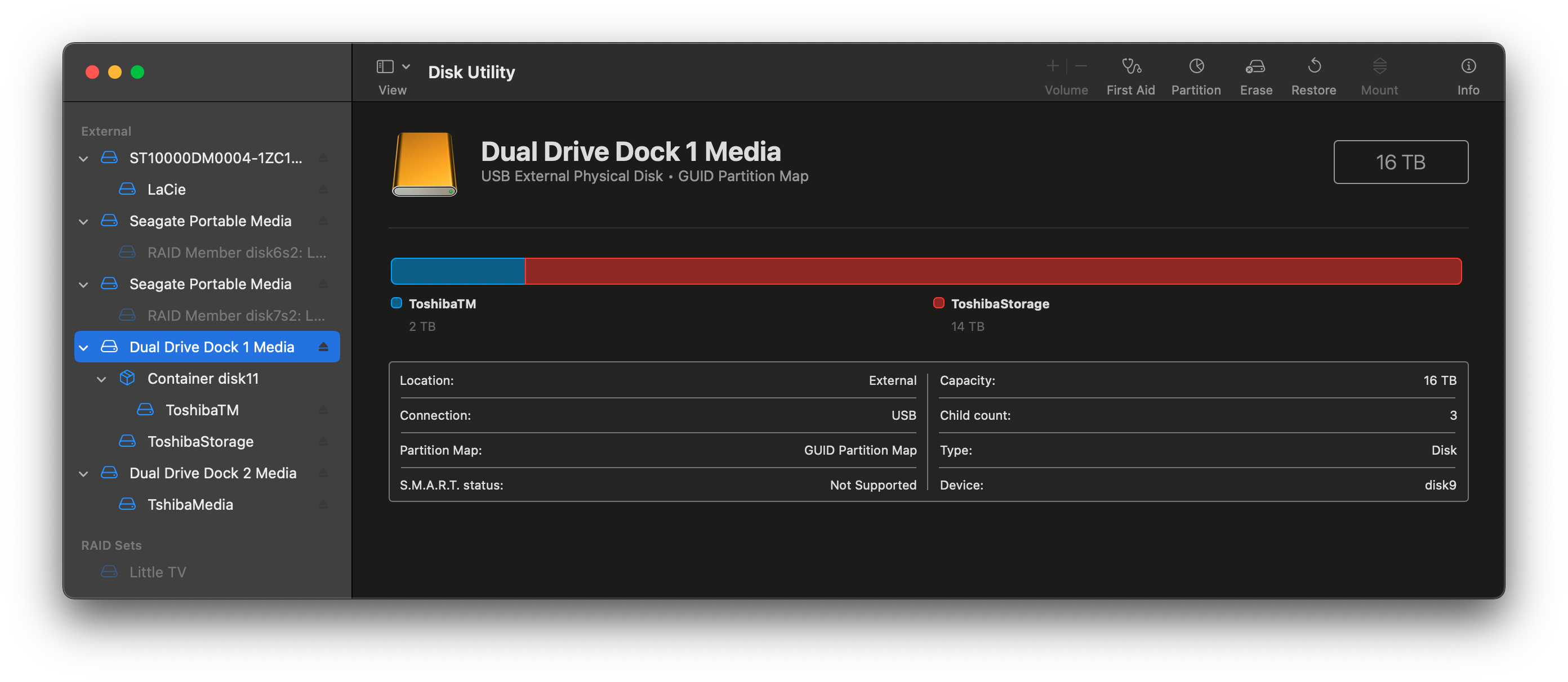 • disk10 is an external 16.0 TB drive with a single HFS+ Partition with a single HFS+ Volume, called TshibaMedia. This would be your Dual Drive Dock 2 Media drive.