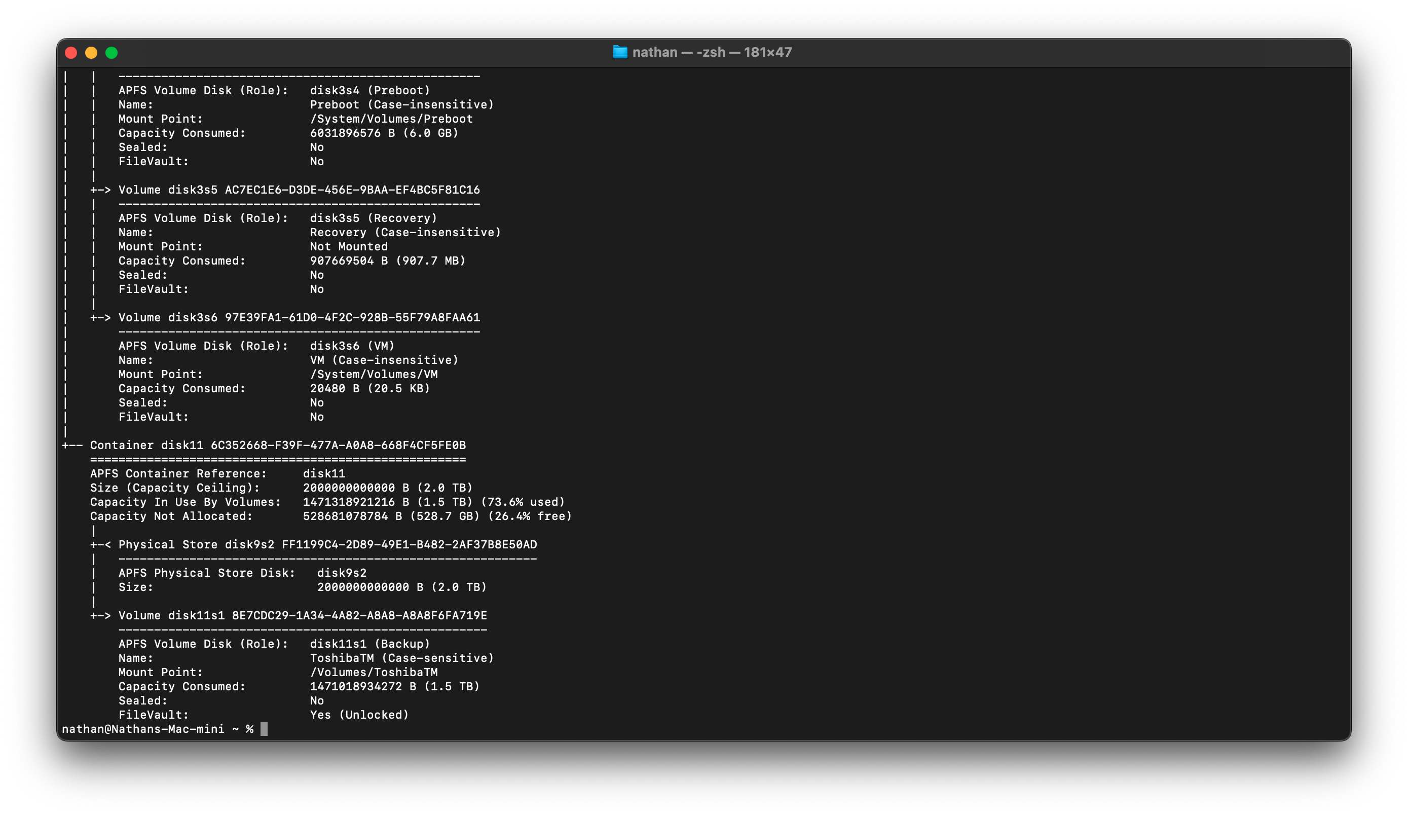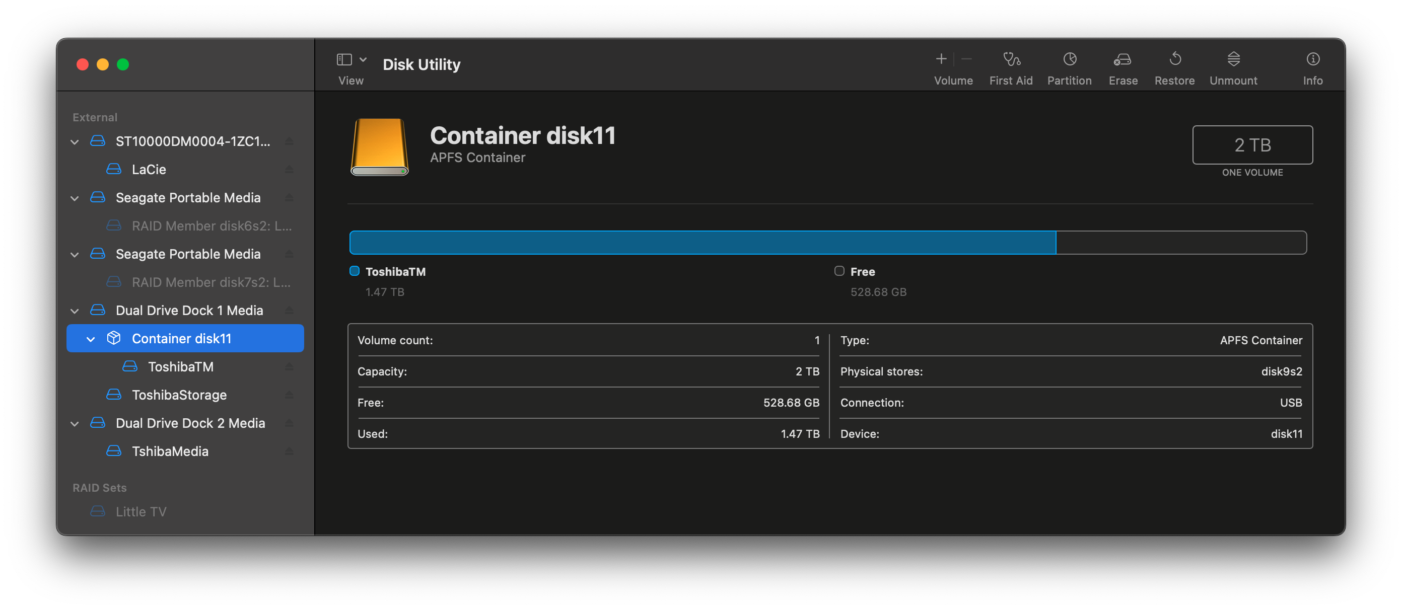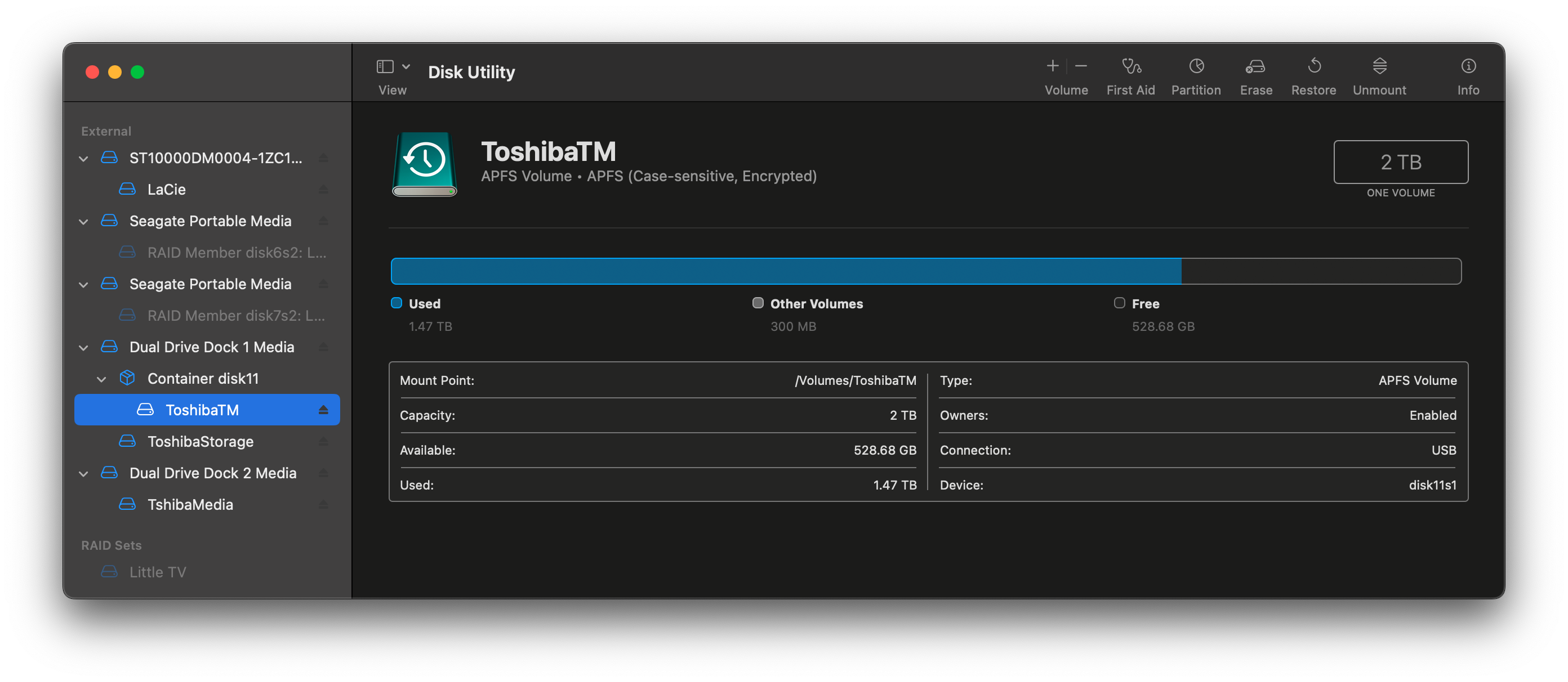 • disk11 has a single 2.0 TB APFS Container with a single APFS Volume, named ToshibaTM which appears to be used for Time Machine. disk11 is the only external drive with APFS formatting