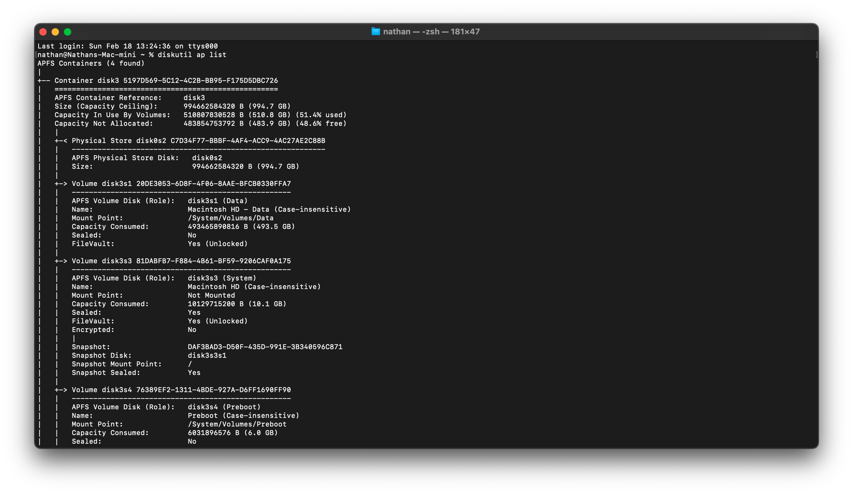 • disk3 is your Mac’s internal drive. It is formatted in APFS with the appropriate APFS Volumes for macOS.