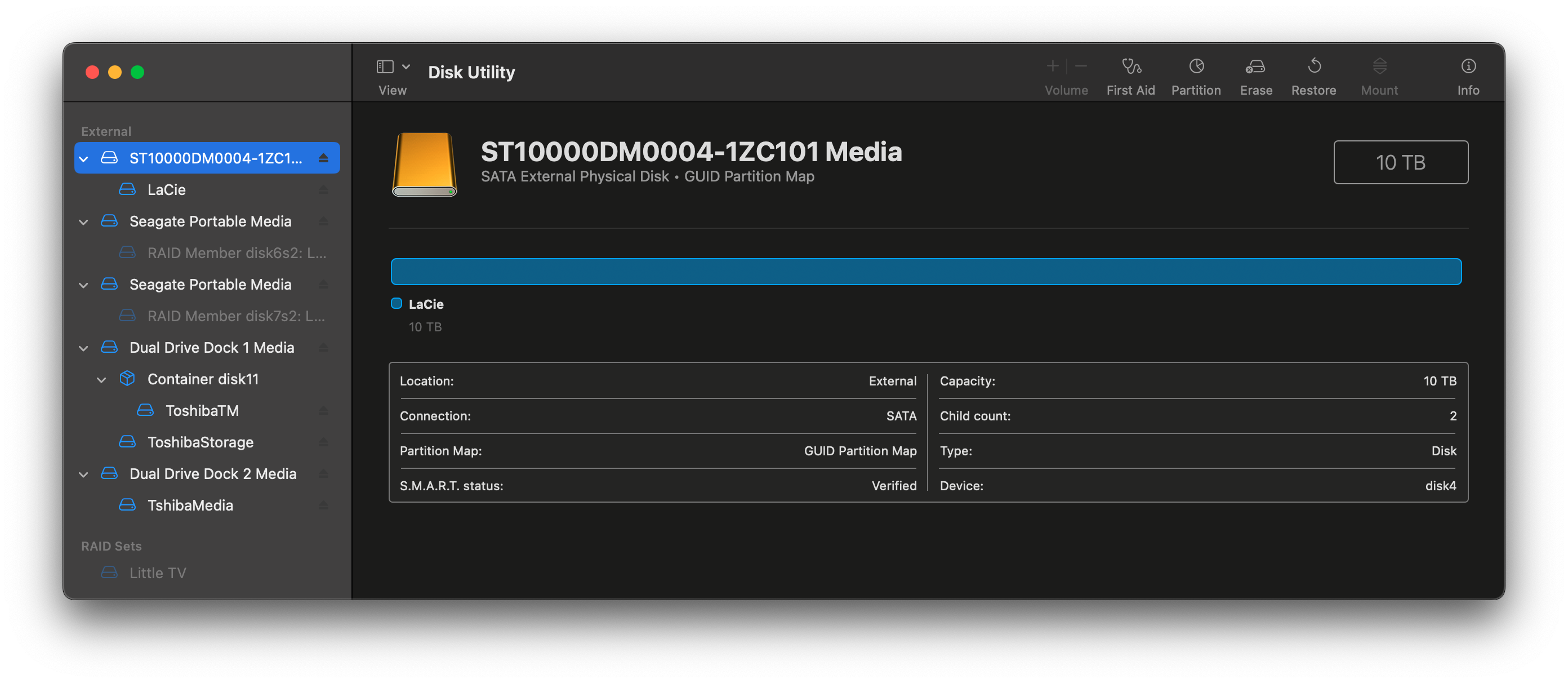 • disk4 is an external 10 TB drive formatted in HFS+. This would be your LaCie drive.