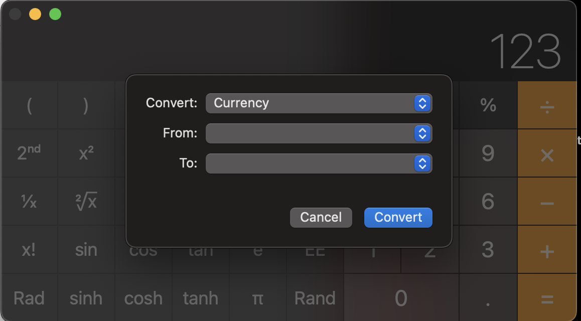 - Selecting Convert --> Currency from Calculator's menu bar does nothing and doesn't respond.
