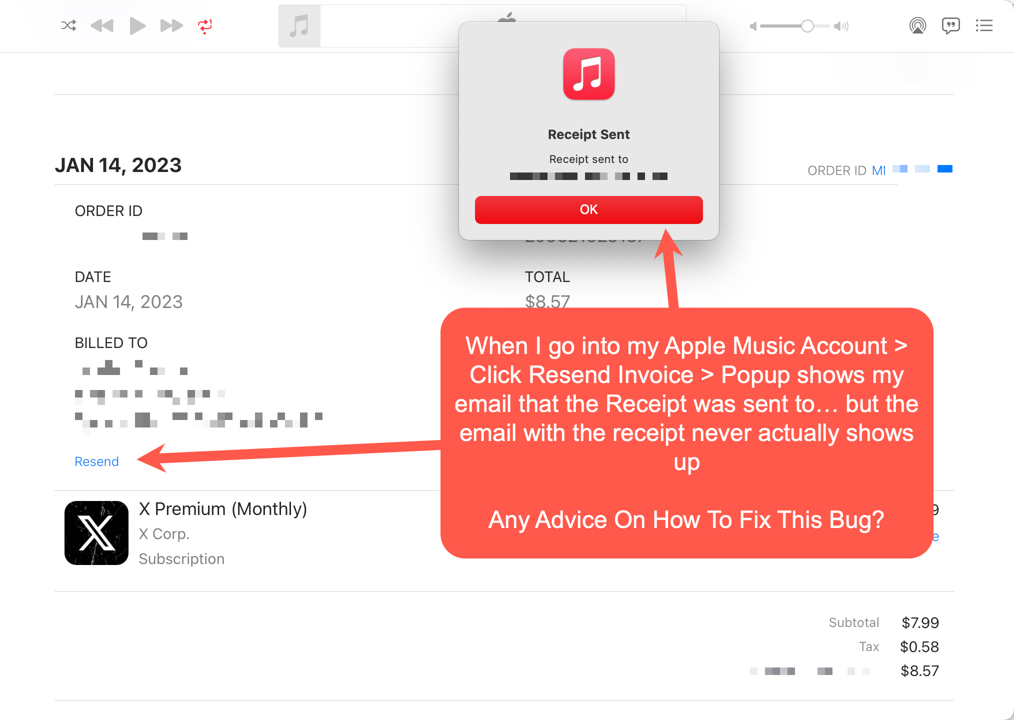 On my Mac when I go into Apple Music > Account > Account Settings > Purchase History > See All > Click on Order ID > Click on Resend [Invoice] a Pop up indicates that my invoice has been sent to my Apple ID email address ... problem is the email with the Invoice from Apple NEVER SHOWS UP... Has anyone else had this issue and subsequently found a successful solution? Thanks in advance for everyone's help and insights =)