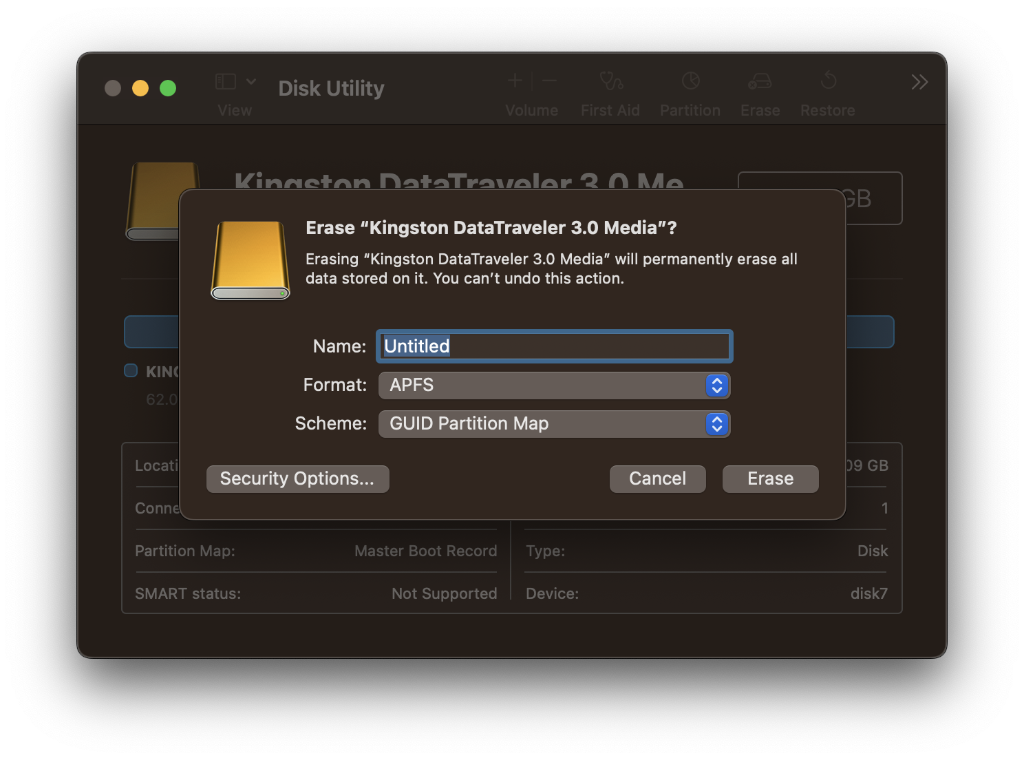 Then select the Samsung device, not any volumes listed under it, then click on the erase icon. There you will be able to select partition scheme and the format, which as previously stated should be GUID and APFS.