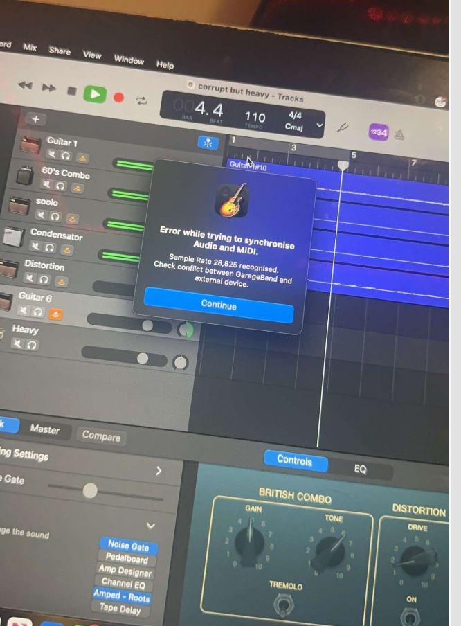 "Error while trying to synchronize audio and midi. Sample 28,285 recognized. Check conflict between GarageBand and external device."