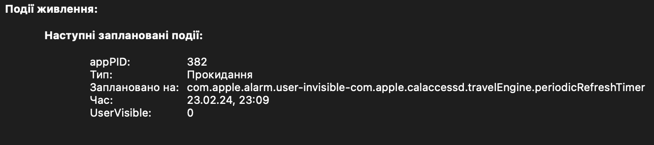 P.S. interface language is Ukrainian, so use a translator if you don't understand something, thank youcom.apple.alarm.user-invisible-com.apple.calaccessd.travelEngine.periodicRefreshTimer - The computer wakes up on its own at a random moment in the middle of the night and in the morning is completely discharged