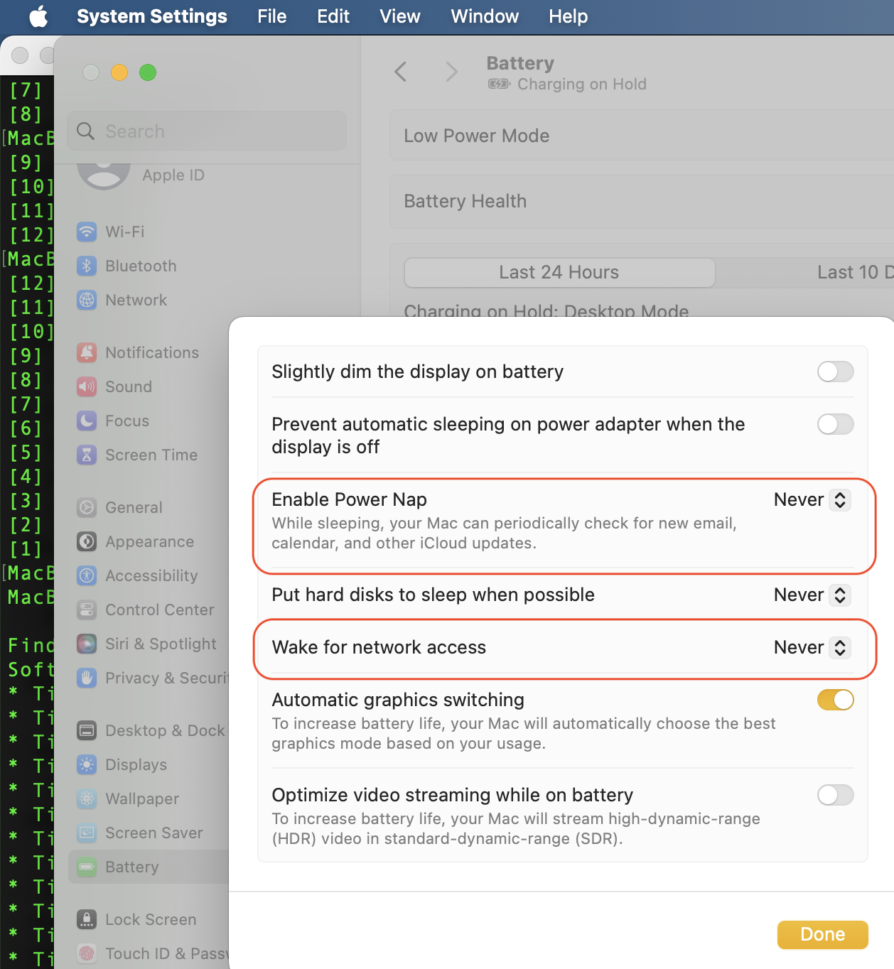 I'm sharing my problem. I have a MacBook Pro 16" 2019, Mac OS 14.3.1. Over the past 3-4 months, I began to notice that in the morning the computer does not turn on and is completely discharged. I decided to check it: I charged the MacBook 100%, then disconnected it from the external monitor, disconnected the entire peripherals, then turned off the MacBook completely, closed the laptop cover and went to bed. In the morning, the MacBook is completely discharged. After searching for information, I came across a possible cause of this problem, namely some "setting" in the "power" tab (attached a photo). Does anyone know how to turn this "setting" off? It's generally strange that Apple could have allowed this