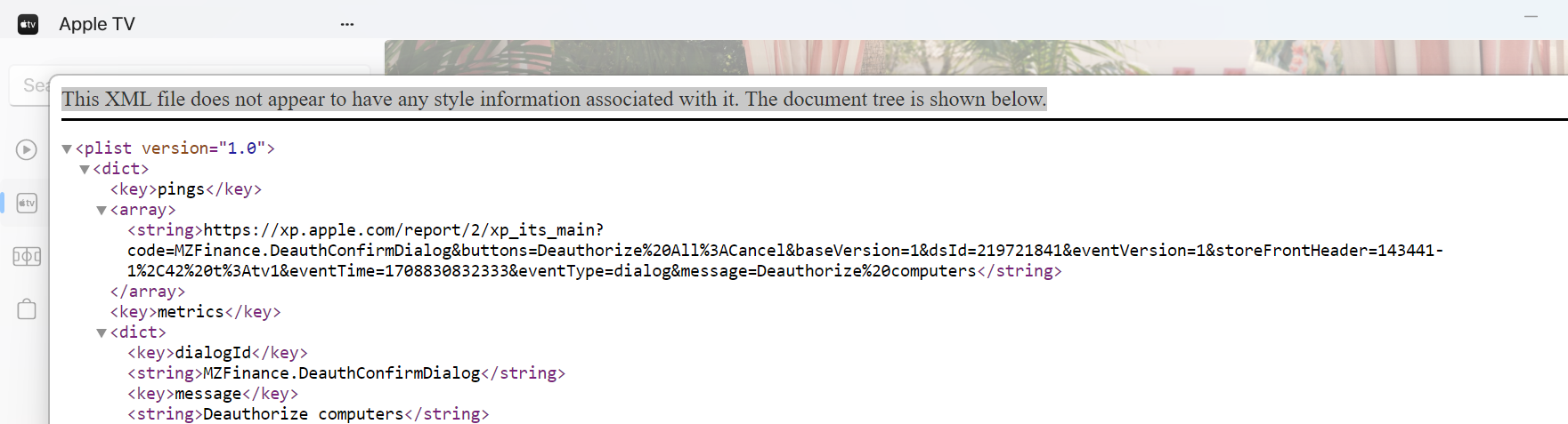 I'm trying to authorize a new computer and found that I have authorized too many. I do not have access to the other computers, so I went to my account and clicked the Deauthorize All button. I've done this in Apple Music and Apple TV. Both display an html page titled: This XML file does not appear to have any style information associated with it. The document tree is shown below.