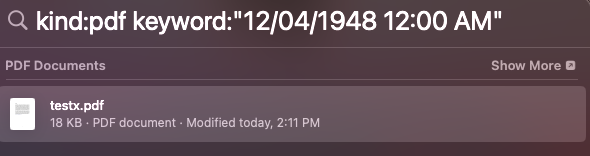 Once that is done, you can locate that PDF easily with the following Spotlight search: