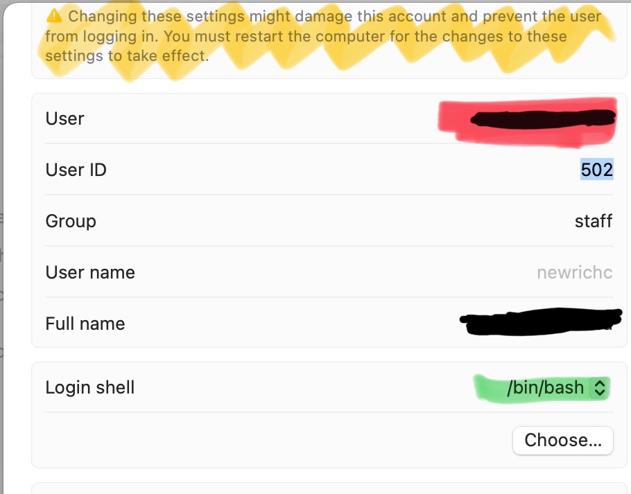 I had issues a few months ago after the Sonoma update. Finally got my computer working BUT with a few strange problems. Certain apps. etc. but again got things working. Today I had time to look into issues. For Ex. I have alias icons on Desktop, Textedit/iMovie/GoogleProEarth/Word/Excel, etc.. on desktop. Then to USER/GROUPS to check shell setting, bin/bash, at Terminal screen, being told my default shell is zsh and I should change it to /bin/zsh/. When viewing USER/GROUPS - my user picture and user name as admin. but noticed my apple ID isn't showing? My old User Name does show Apple ID. I decide not to make any changes at this time. Need some expert help... please.