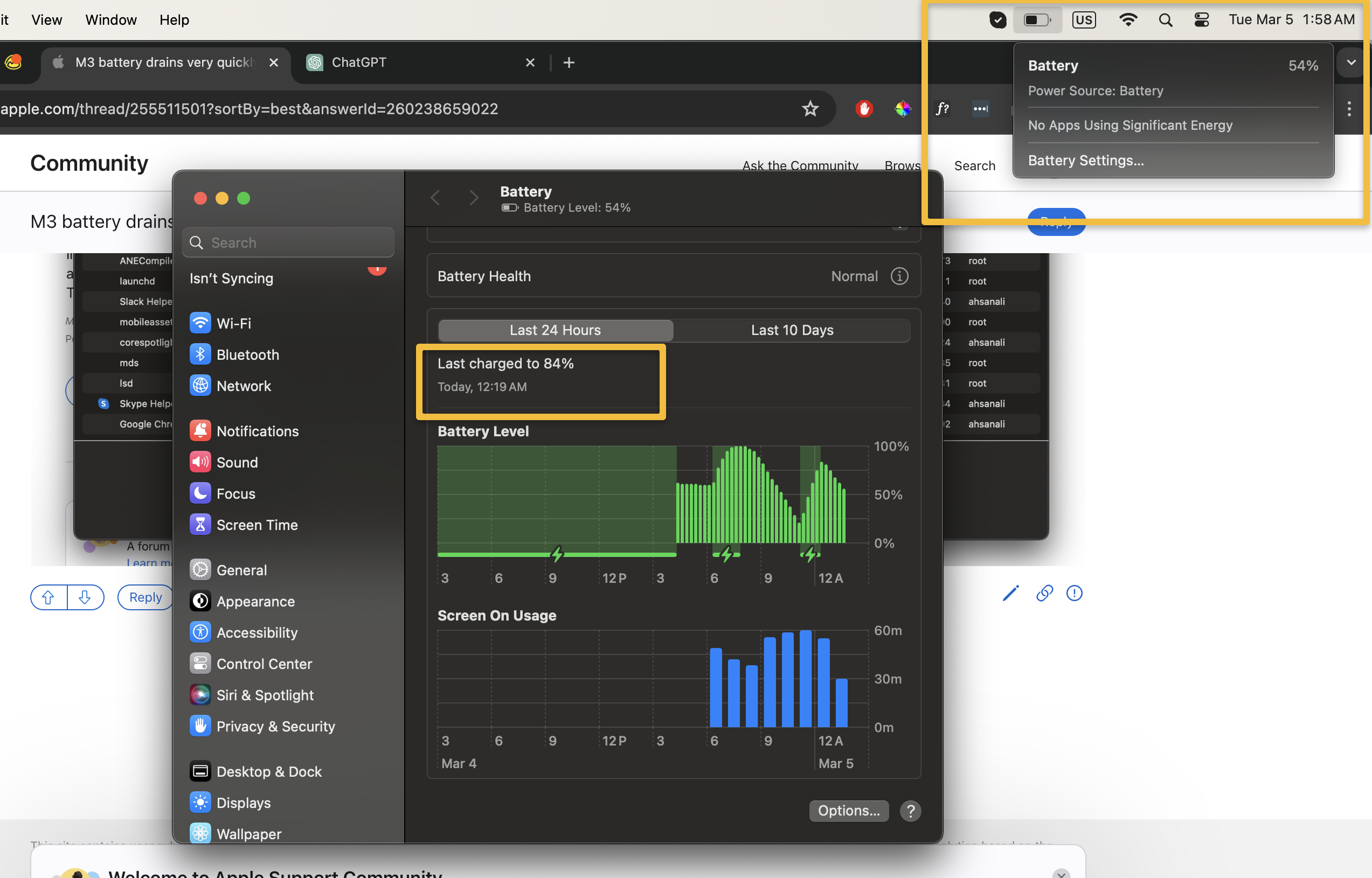 - Installed Al Dente Pro to increase battery lifespan and monitor instant consumption. Specifically, I set the maximum charge to 75%, enabled sailing mode from 50%, and disabled charging when the battery exceeds 35°C to increase battery duration. I charge the Mac to 100% only if I know I will be out for work and won’t have a power outlet at hand
