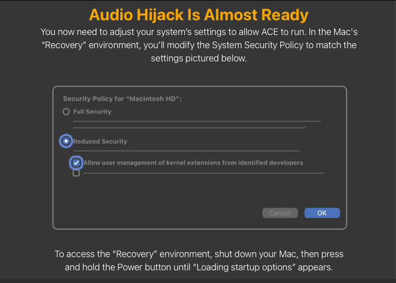 M2 Mac Studio Ultra, Sonoma 14.3.1 trying to install Audio Hijack and it want s me to get into the “Startup Security Utility”. But when I follow the instructions, there is no option for the “Startup Security Utility”. Is there another way to get there?