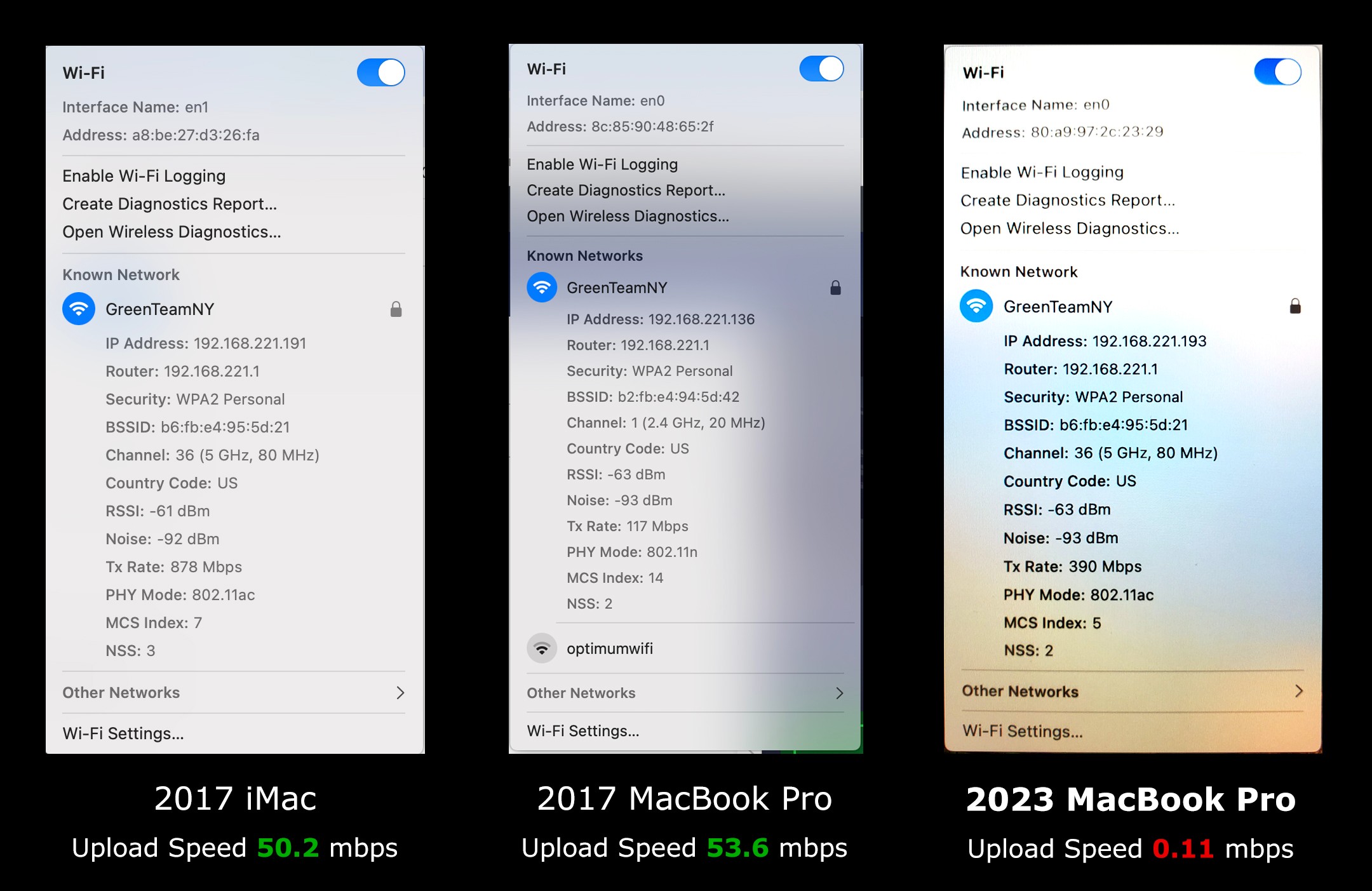 BACKSTORY: I have an old 2017 iMac (27") and and old 2017 MacBook Pro (15") -- both of which have a totally fine internet upload speed when connected to my home Wifi (~50 mbps). Never any connectivity issues on either.