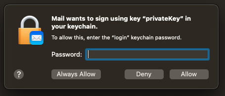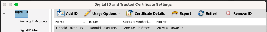 I made a simple digital signature in Adobe Acrobat Reader 2023.008.20470, which it stored in Mac Keychain Store, for signing a state government PDF document, which I attached to an email. When I sent the email, it demanded my password, twice, apparently to attach a digital ID signature.