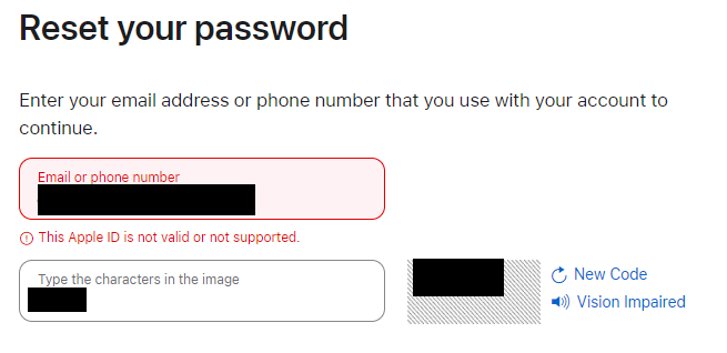 and when i go to unlock the account at https://iforgot.apple.com/ , i get "This Apple ID is not valid or not supported"