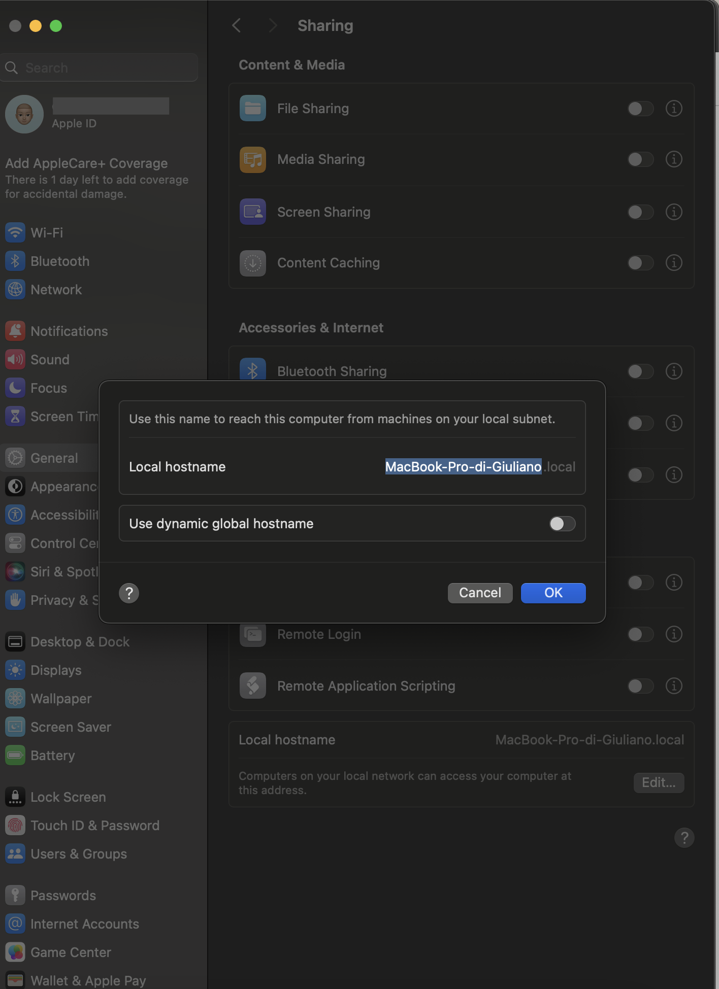 On settings, and even by using the `scutil`command, I can see that my local hostname is correct.