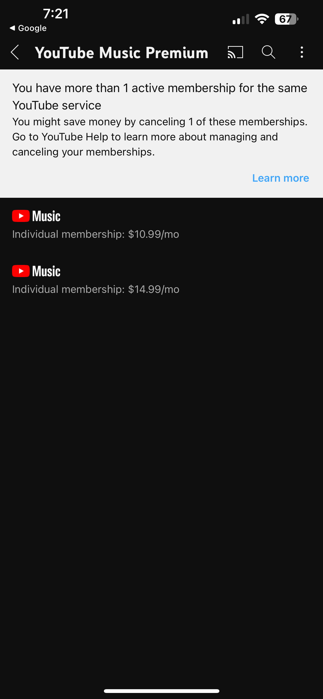 I’m being charged on two different accounts Apple and Google for YouTube premium music. I would like to cancel the Apple one and be refunded please. And for all the other months I’ve been charged double