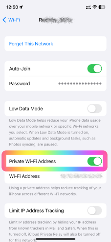 Open the Settings app, then tap Wi-Fi. next to a network. Tap to turn Private Wi-Fi Address off or on. If your device joined the network without using a private address, a privacy warning will explain why.