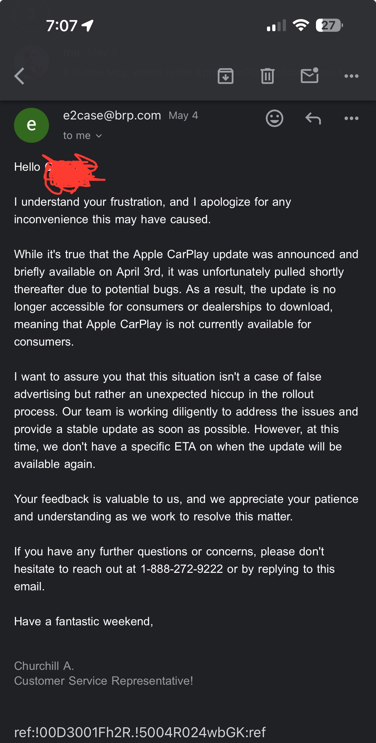 I purchased my 2024 Spyder Sea to Sky and I expected to have CarPlay. There are no updates available. Is BRP trying to deceive consumers.