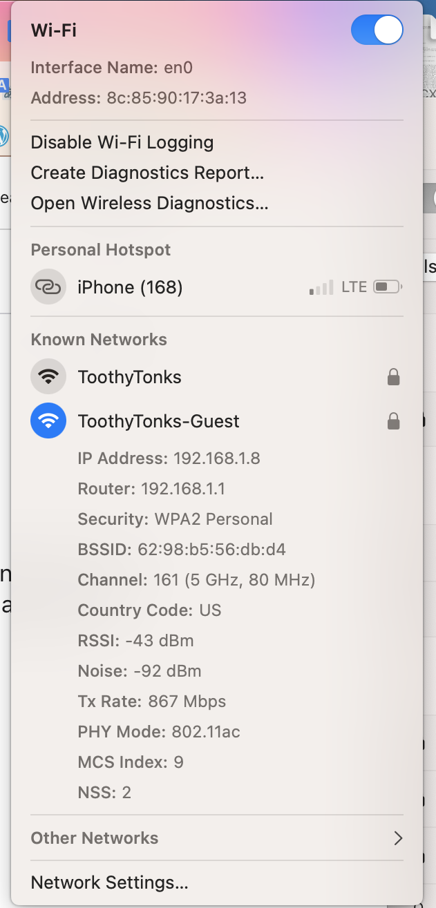 I've been having Wifi connectivity issues on my MacBook Pro for the past year or so and they've been getting gradually worse. The most consistent issue is the wifi will frequently disconnect, disrupting things like video calls. I do not have this issue with any of my other devices (iPhone, iPad,) nor is anyone else in my household experiencing this issue on their respective computer. Usually turning my wifi on and off will reconnect the wifi, but it will usually do this every 30min-1hr.
