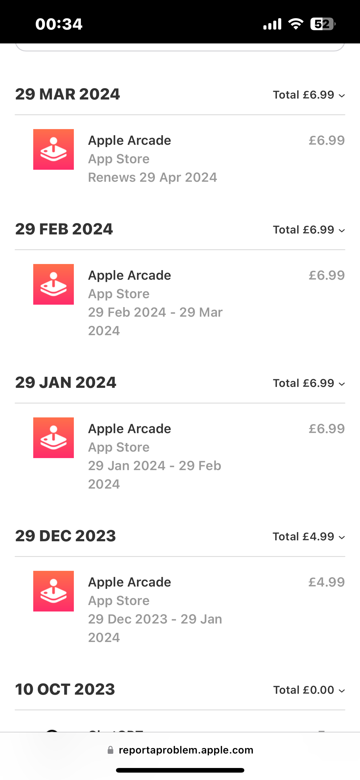 I have just viewed my purchase history using the link “https://reportaproblem.apple.com/?s=13” and I have been charged for Arcade every month since 29 Dec 2023. It says it will renew on 29 Apr 2024. This makes me check my subscriptions, through the App Store, and I see my active as well as my inactive subscriptions. Apple Arcade is not there. I found this really weird so I went and tried to download an Arcade game. I could download and play it. Keep in mind Arcade was not in my active subscriptions. I do remember having a free trial for Arcade and I also definitely remember cancelling it before the charges came. Could you also check if you had a free trial running around 29 Dec 2023? Thank you.