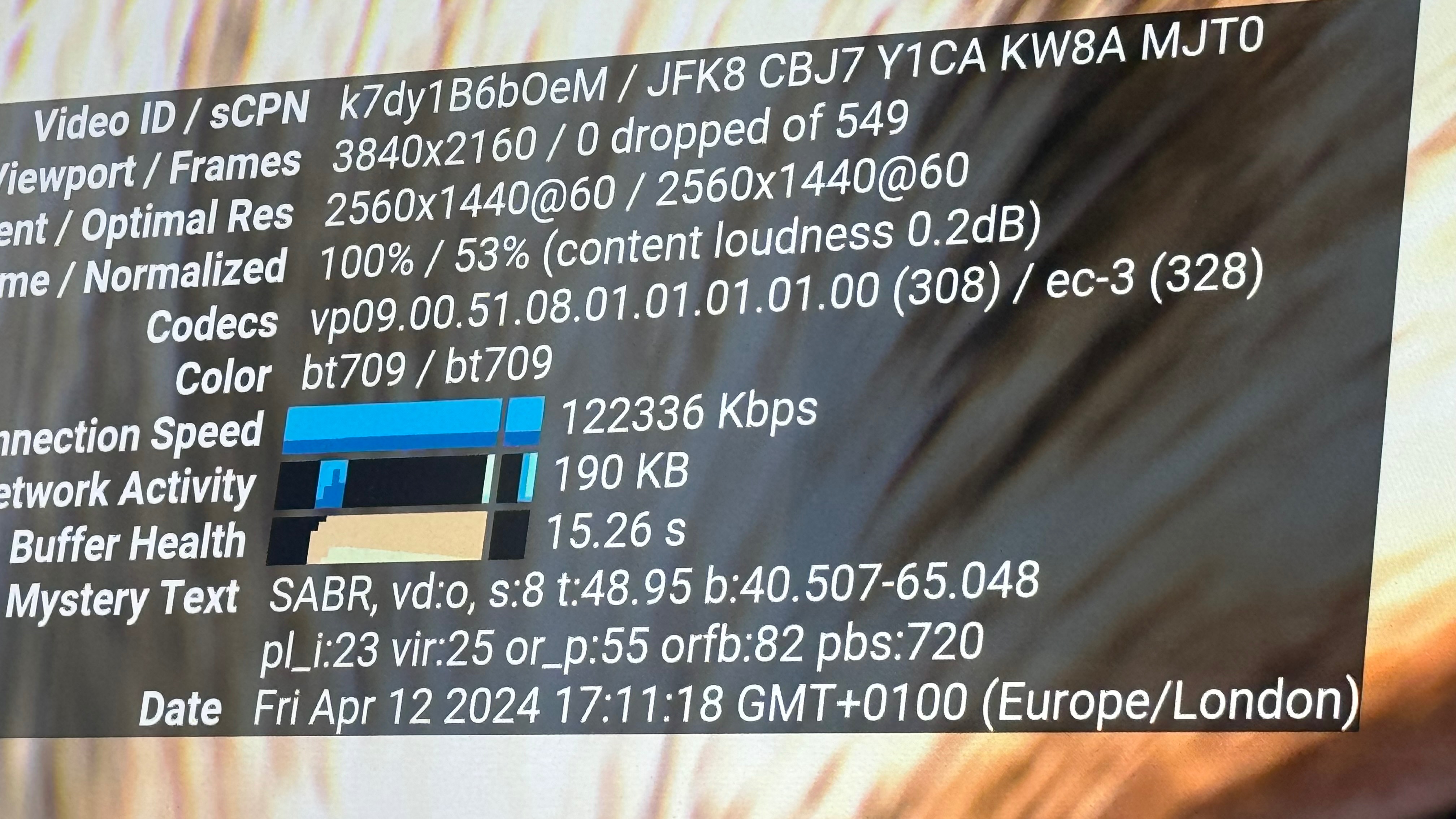 2) First off by checking the quality section in the settings menus within the app and looking at resolution which only shows 1440p as being the max I can choose and not 4k but also clicking the stats for nerds button within the app which brings up those stats and it shows the video is presented in 4k but I am watching at 1440p. I’ll try and put a screen shot up for reference if I can.