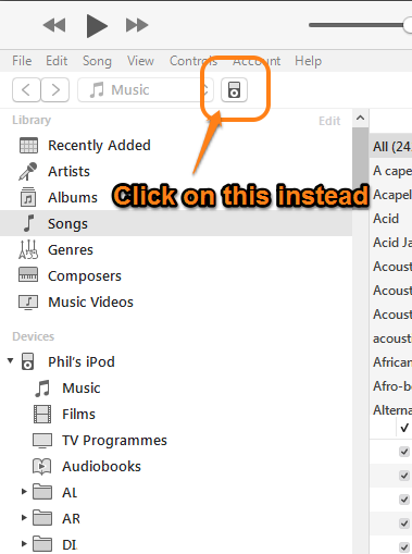 That will display the Device/Settings/Summary pane. (My screenshots show iTunes for Windows, but for this purpose they are the same thing and will help solve this issue for you.)