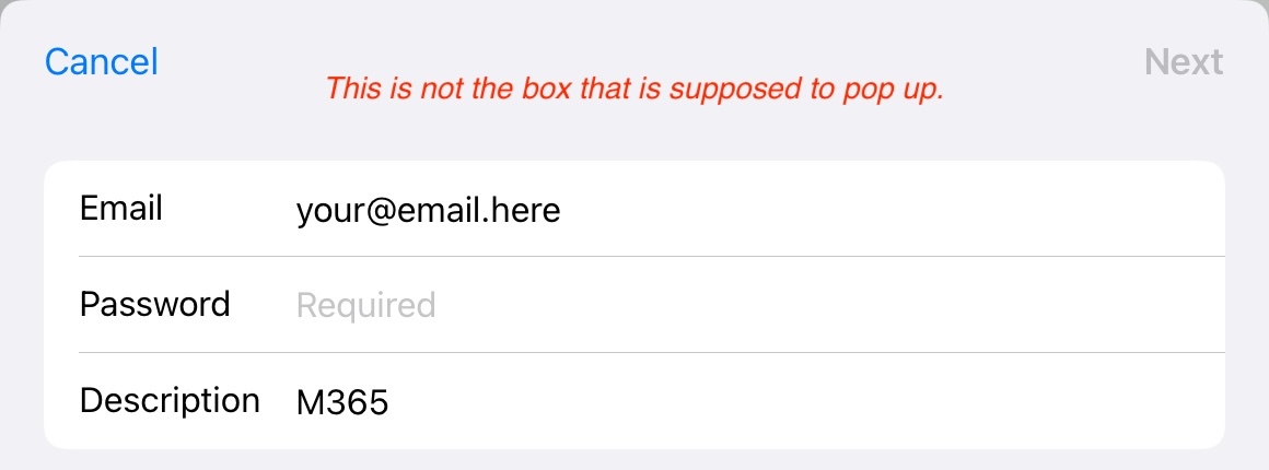 Issue: After clicking "Exchange" and entering my custom domain (step 3) the "Sign in to your..." modal box correctly shows up and I press "Sign In" per the directions. However, the next Microsoft box where I should enter my M365 password never shows up. Instead after a short pause it takes me to the native iOS modal box to enter the Exchange password which isn't correct [shown below], and doesn't work.