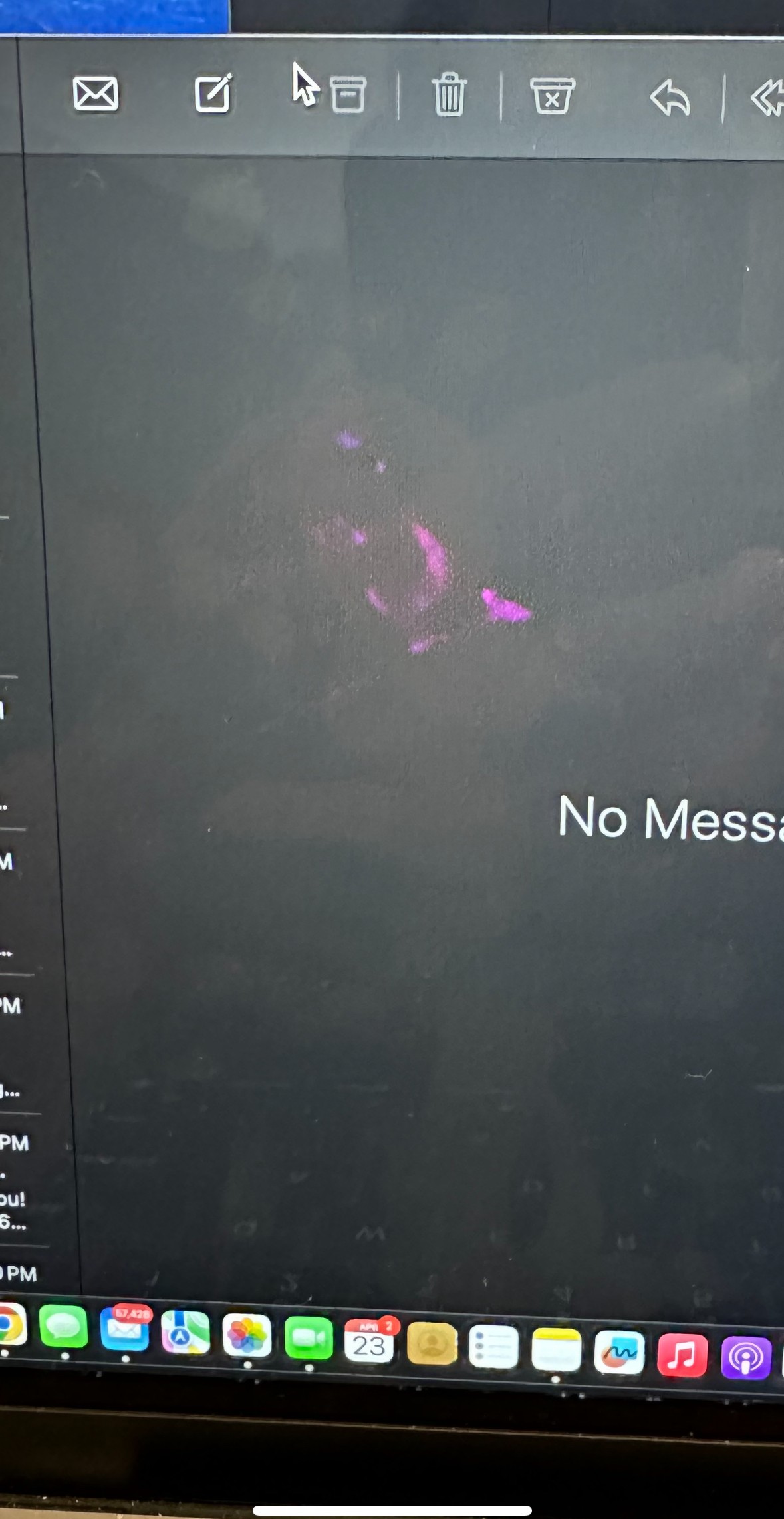 "Hi, when i open dark screen at my macbookair. i can see little red or purple shadow but it's only for dark color. When i open some white color its gone. im sharing to picture than you can easly see it. Thank you Display Screen has a shadow"