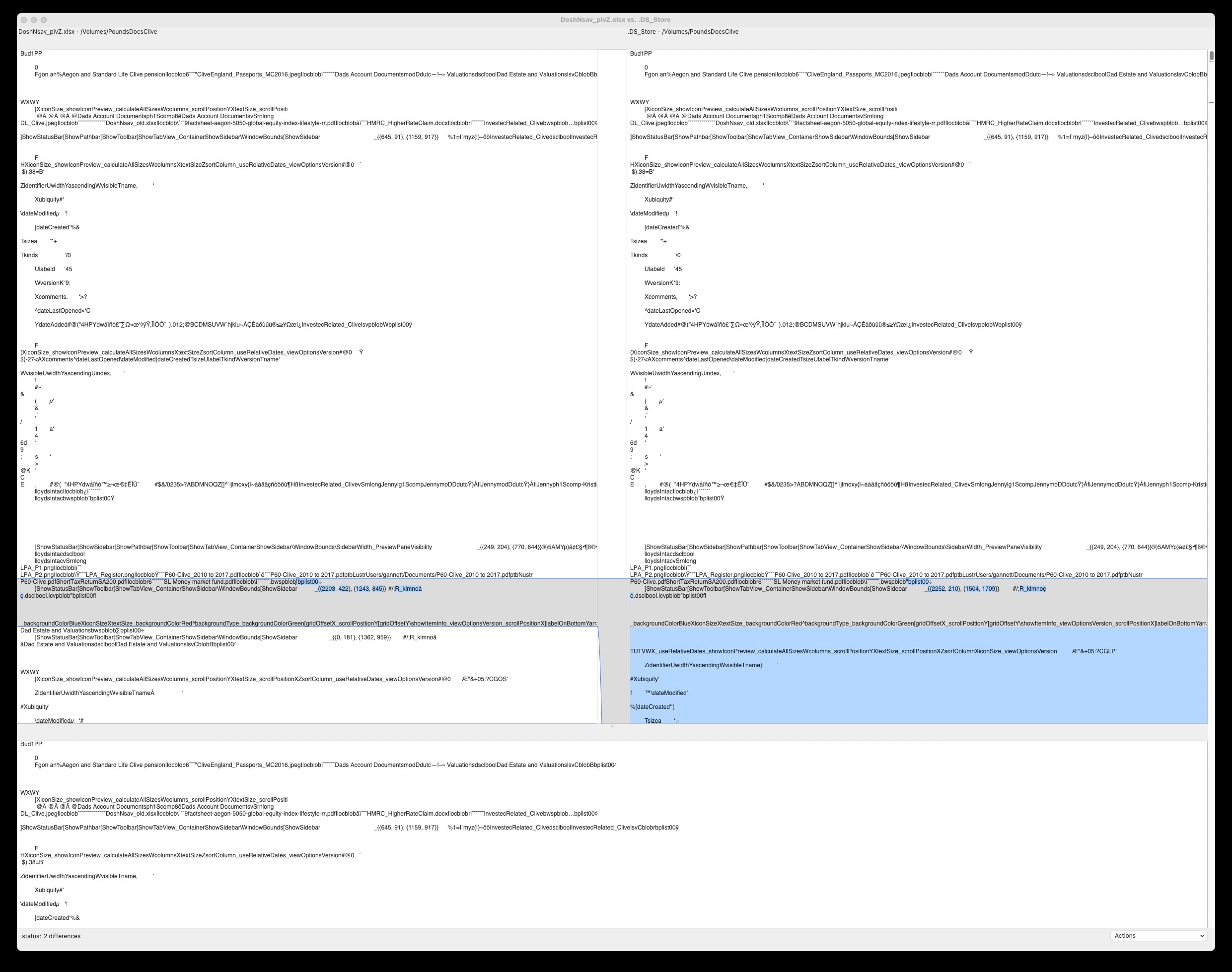 This opendiff listing shows a side by side comparison of .DS_Store file and the broken Excel file. Note the .DS_Store data at the start of the Excel Spreadsheet ....