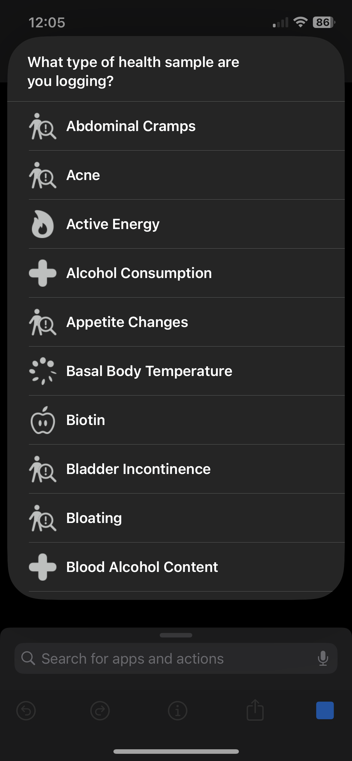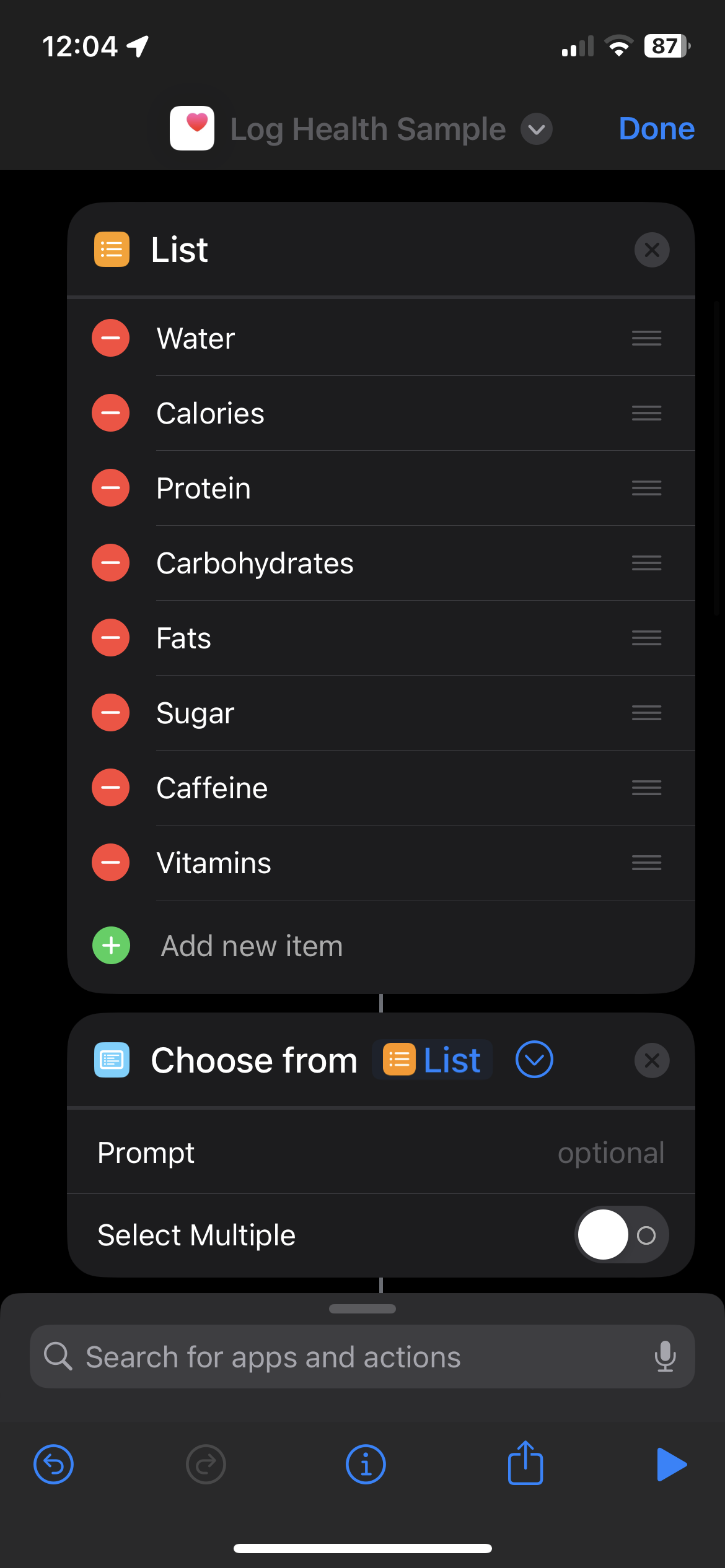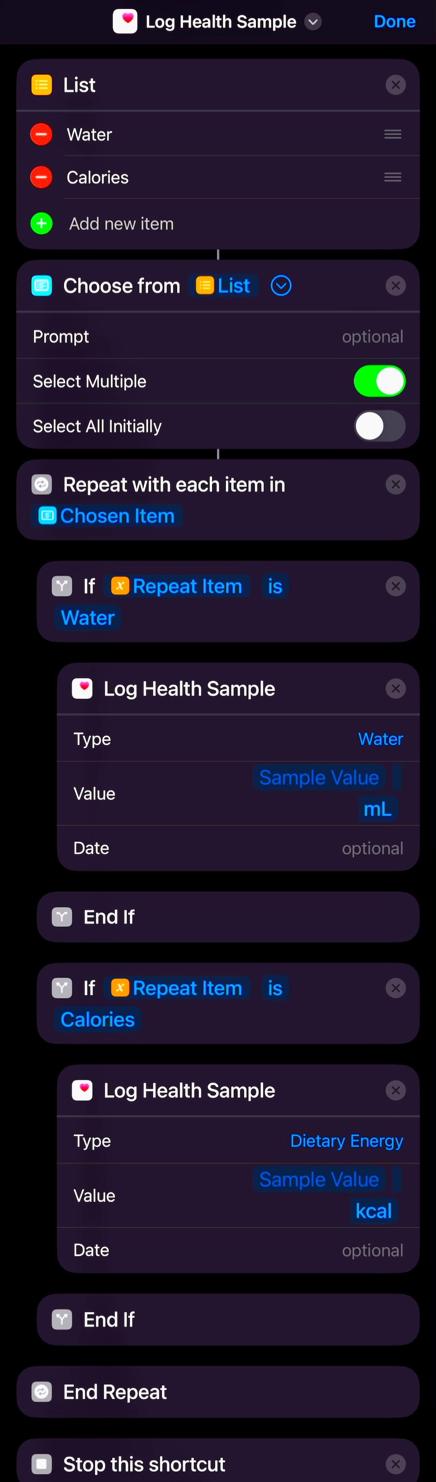 Hello, I wanted to make a shortcut that allows you select and log only from the desired values (eg if you want only vitamins, calories, protein and water and headaches). However I now see that you can’t pass a variable into the “Type” field in the “Log Health Sample” action. And when set to “Ask Each Time” you have to search through every single data in the health app. I’d like to pass the variable directly from a chosen item in a list to the log action…