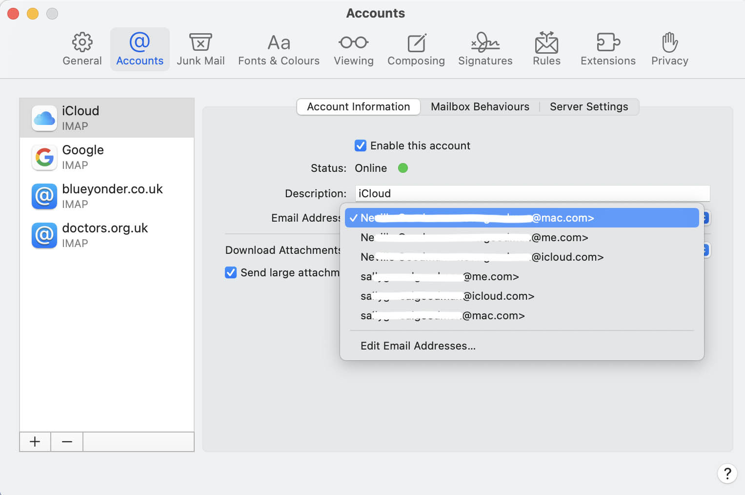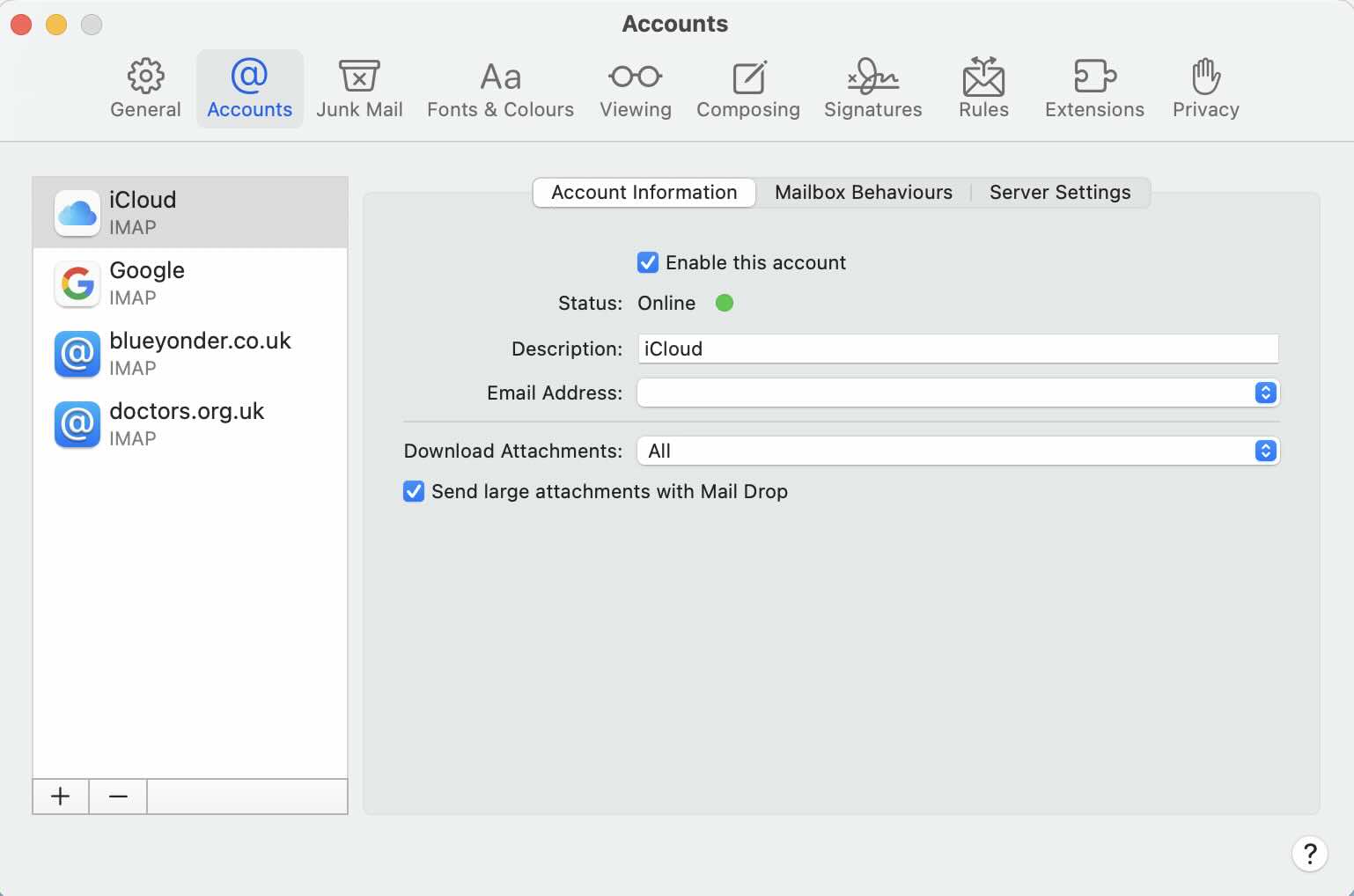 Apple Mail>Settings>Accounts keeps losing my email address. Earlier today, this was the panel: