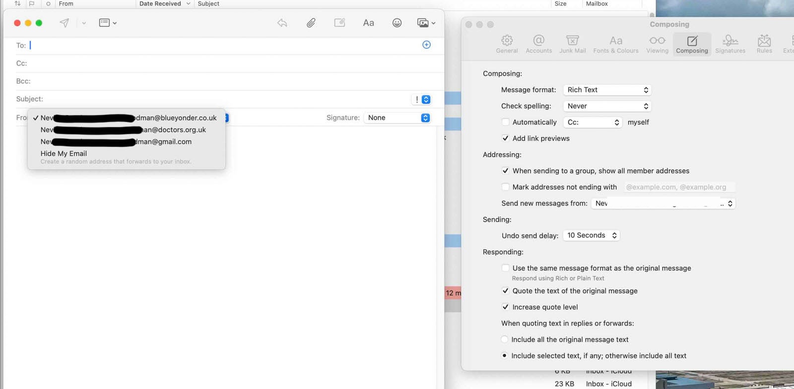 A little while later, trying to write an email, my Apple email did not appear in the From field, and looking again at Settings: