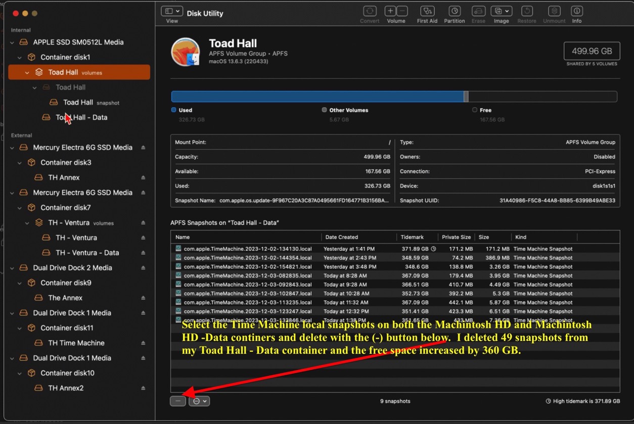 My Mac has recently alerted me to a lack of space for any sort of downloads. I have less than 1 GB of storage left. I checked the storage, and almost 200 GB is being used by “System Data”. I read on other articles that you can access this by going to Disk Utility and then deleting APFS snapshots. When I try to do that, the delete option is greyed out and I am unable to click on it… what on earth do I do???