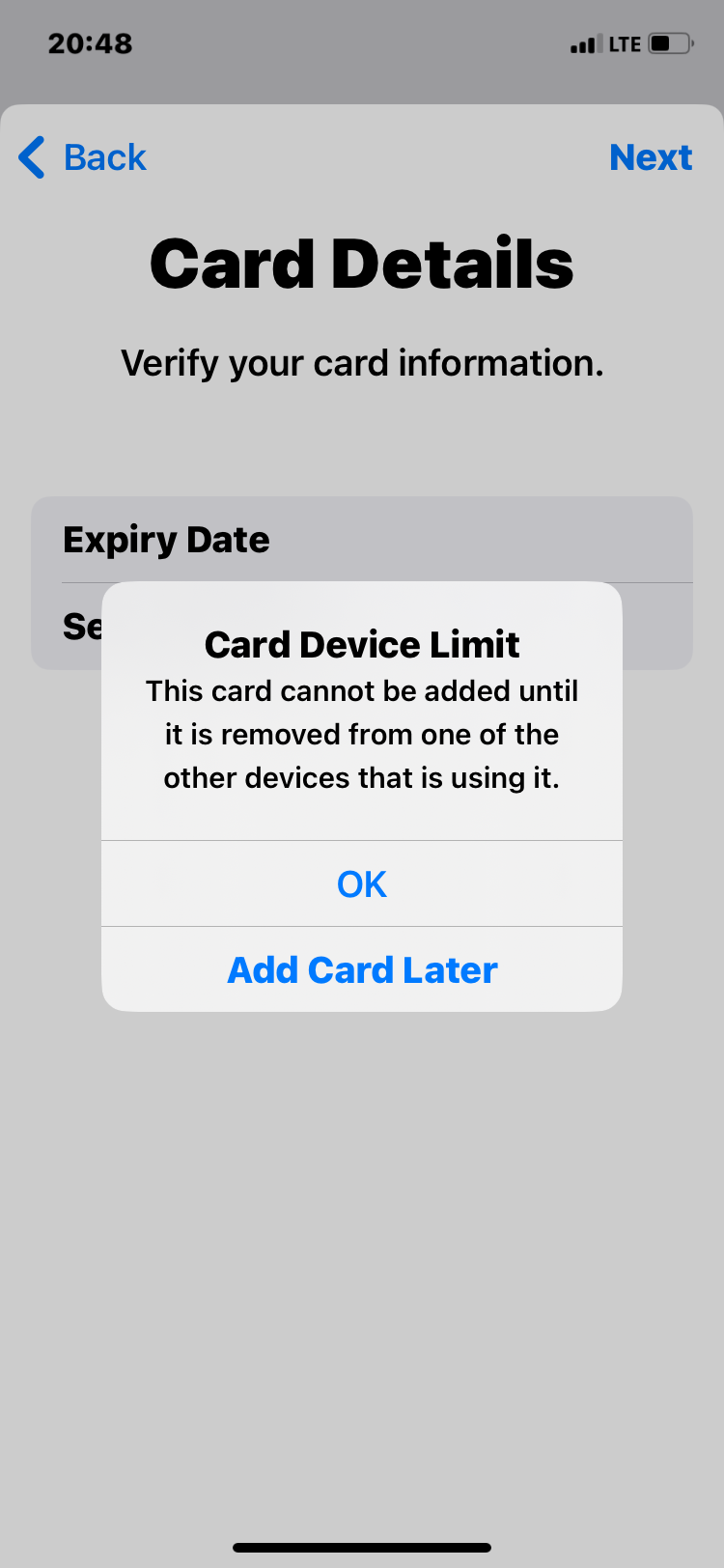 I am unable to add a card to my Apple Wallet, error message “Card Device Limit"
