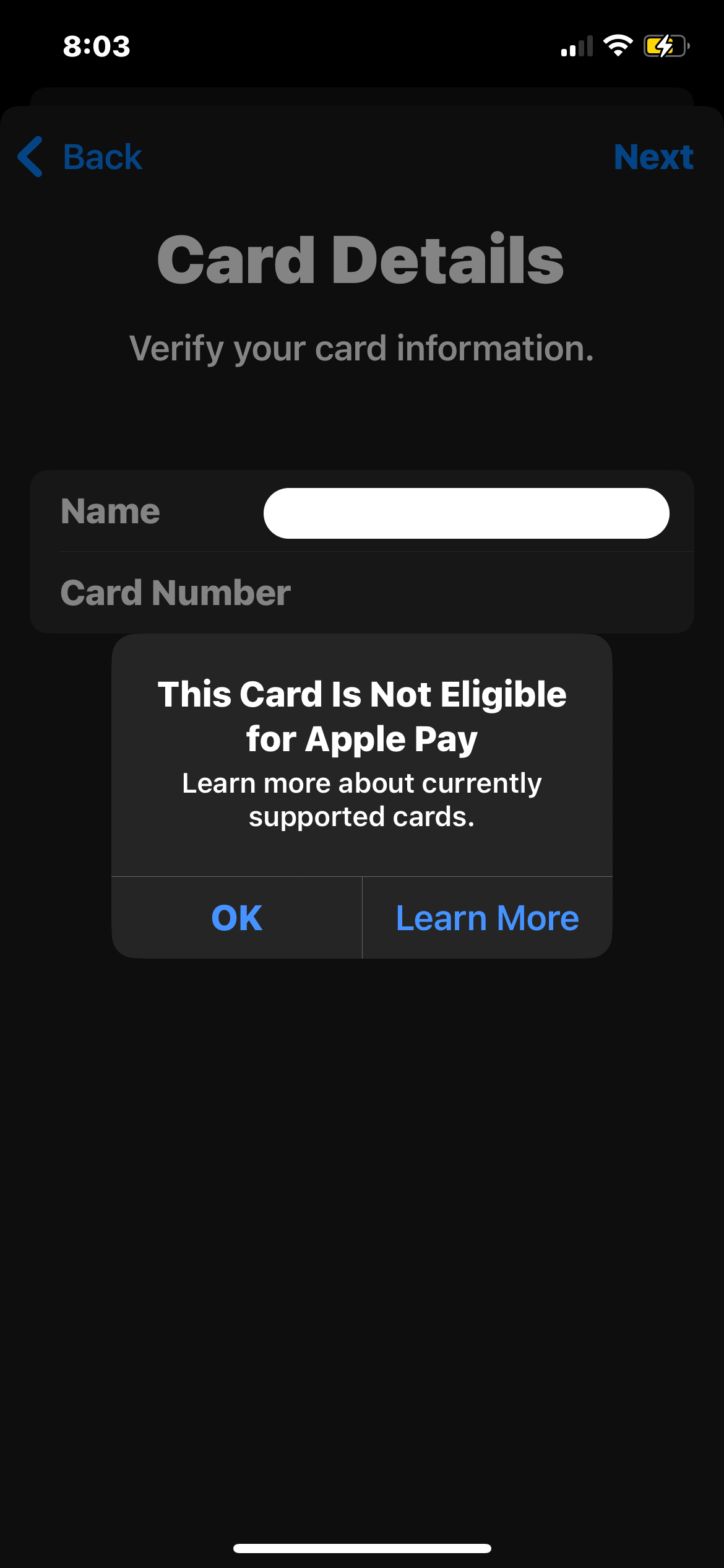 “Card is not eligible for Apple Pay” message while adding my card in Apple wallet
