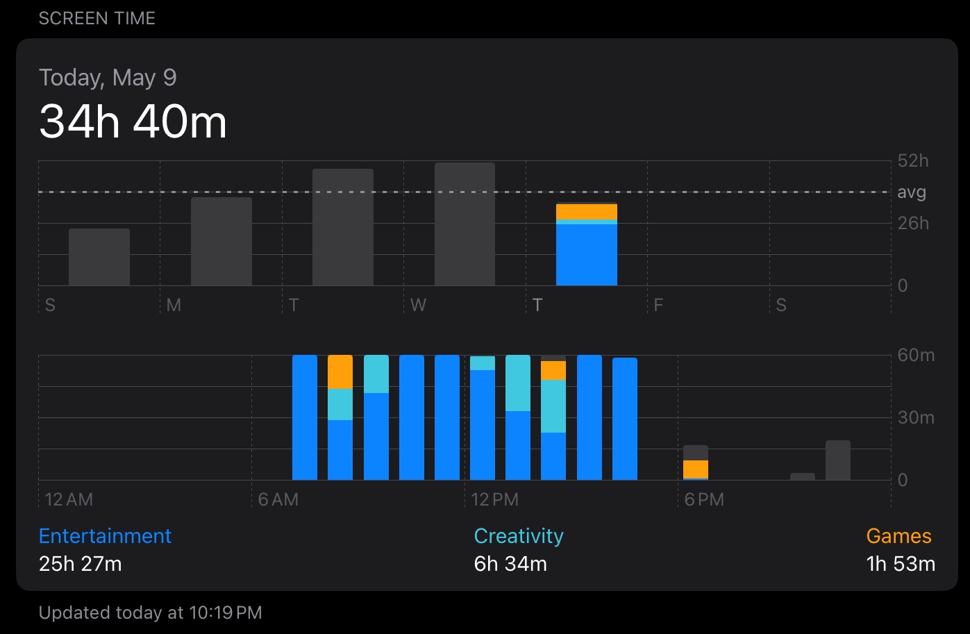 My iPad mini 6th gen (bought in early 2022) is TRIPLING my screen time. I thought that I had it so it was showing my phone and iPad screen time together but it’s just for my iPad and it says almost 35 hours of screen time even though the bar graph for the day shows MAYBE 10.5 hours. It didn’t show any screen time at all for a year and a half and then it was accurate for a few months but now it’s showing impossible numbers. My total for this week is almost 200 hours for 5 days. It also has my phone’s screen time at almost 35 hours but on my phone it says eight hours. It doesn’t really bother me because I don’t limit/pay attention to my iPad screen time but it’s just really confusing.