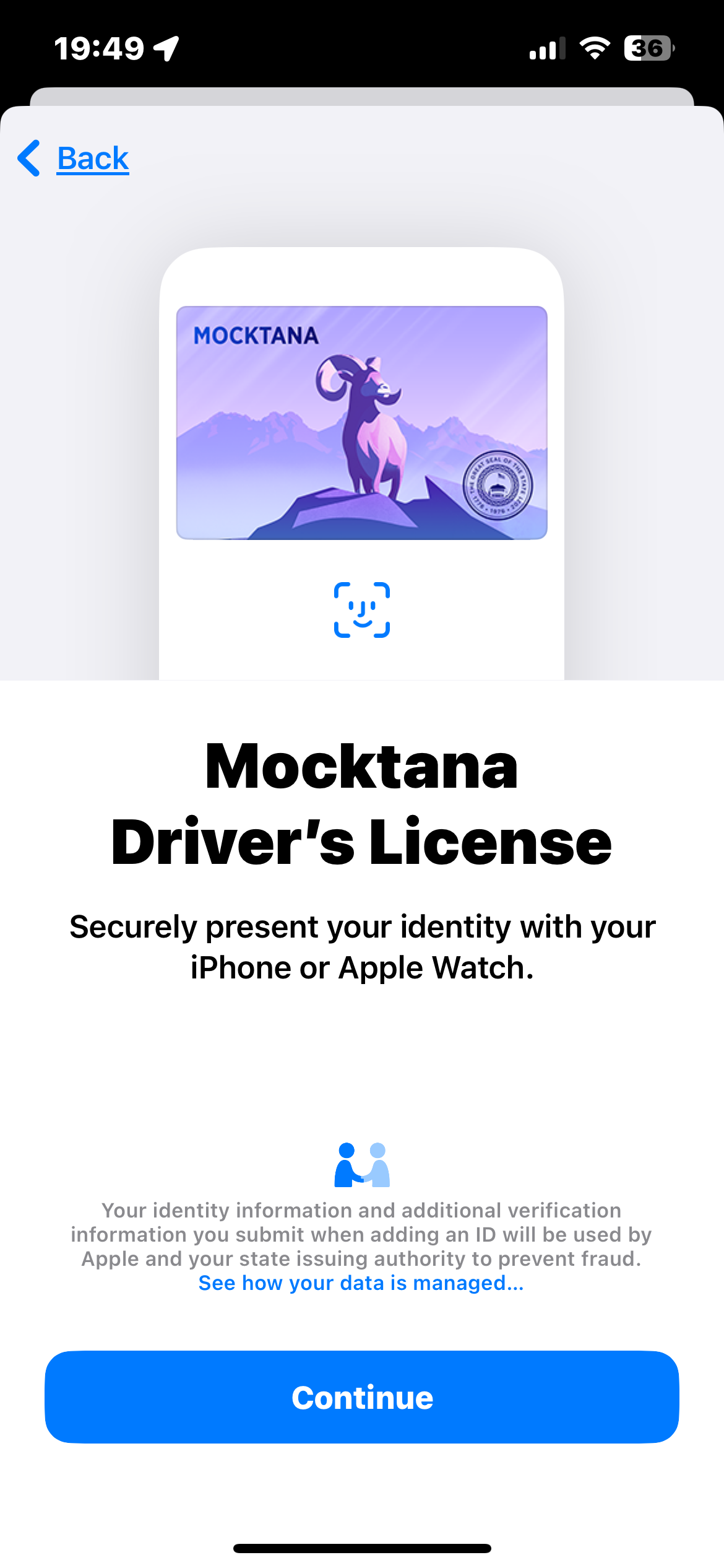 So whenever I go to click on DL or state ID to add to wallet, it shows the 4 states of Arizona, Colorado, Georgia and Maryland, but when I click on it, it shows a completely made up one called “mocktana” which doesn’t seem right.